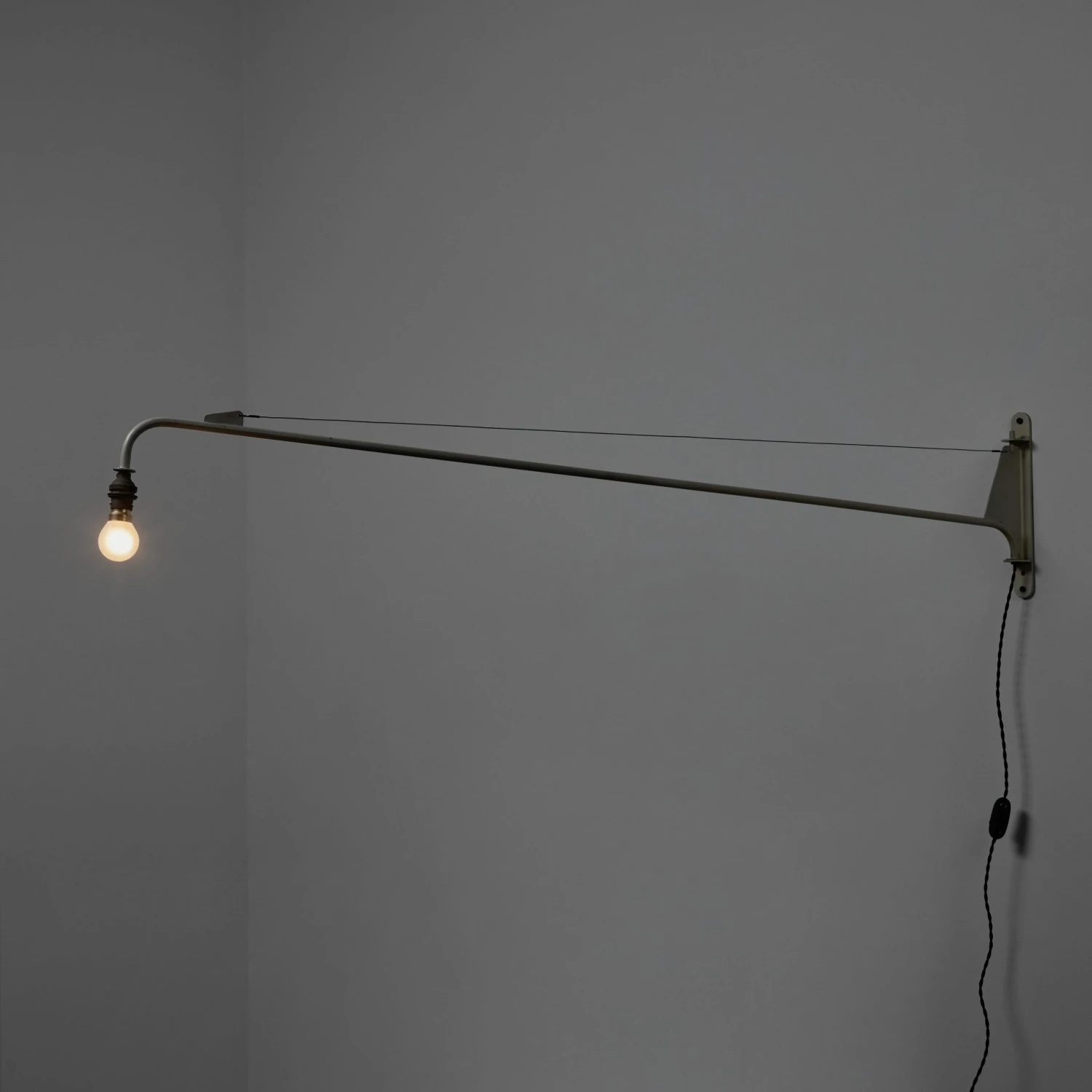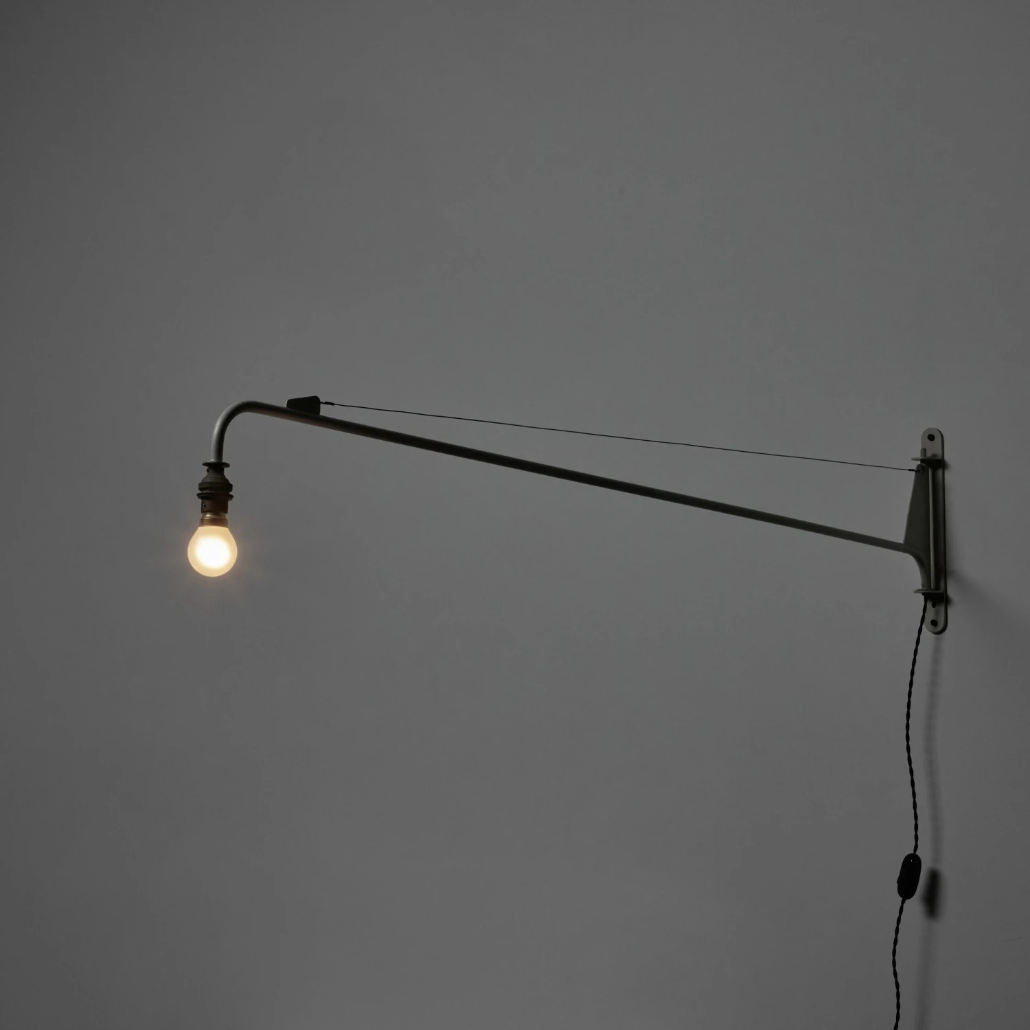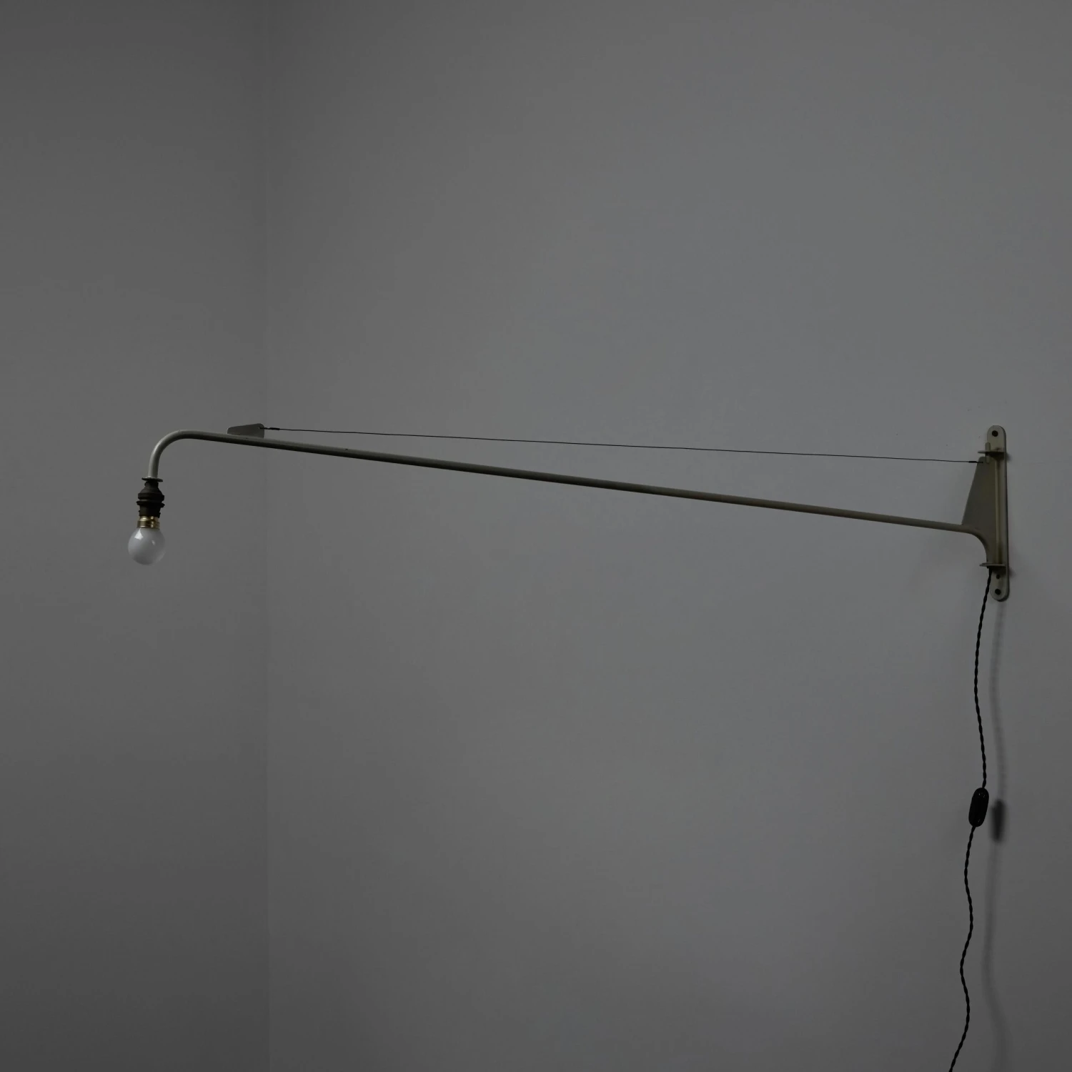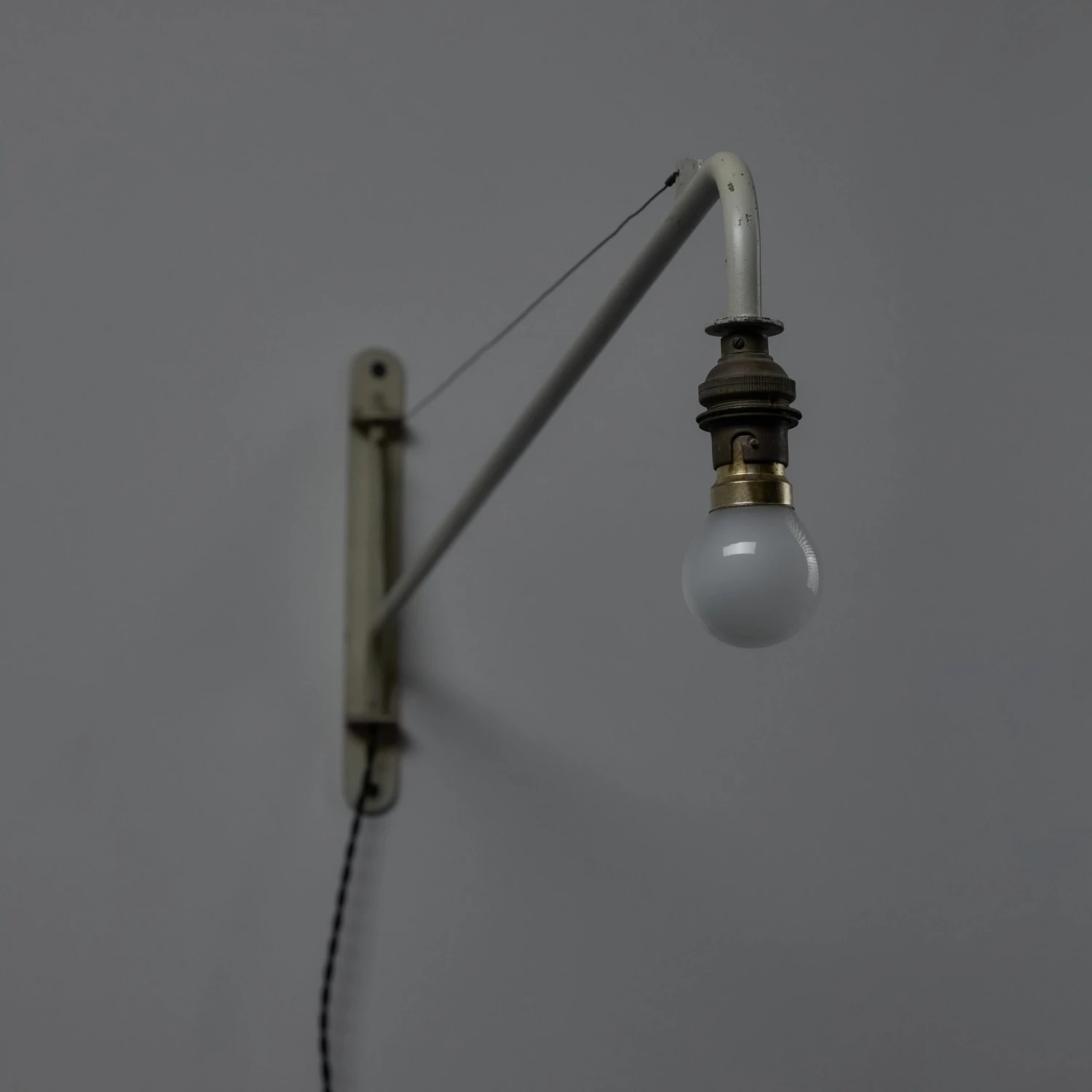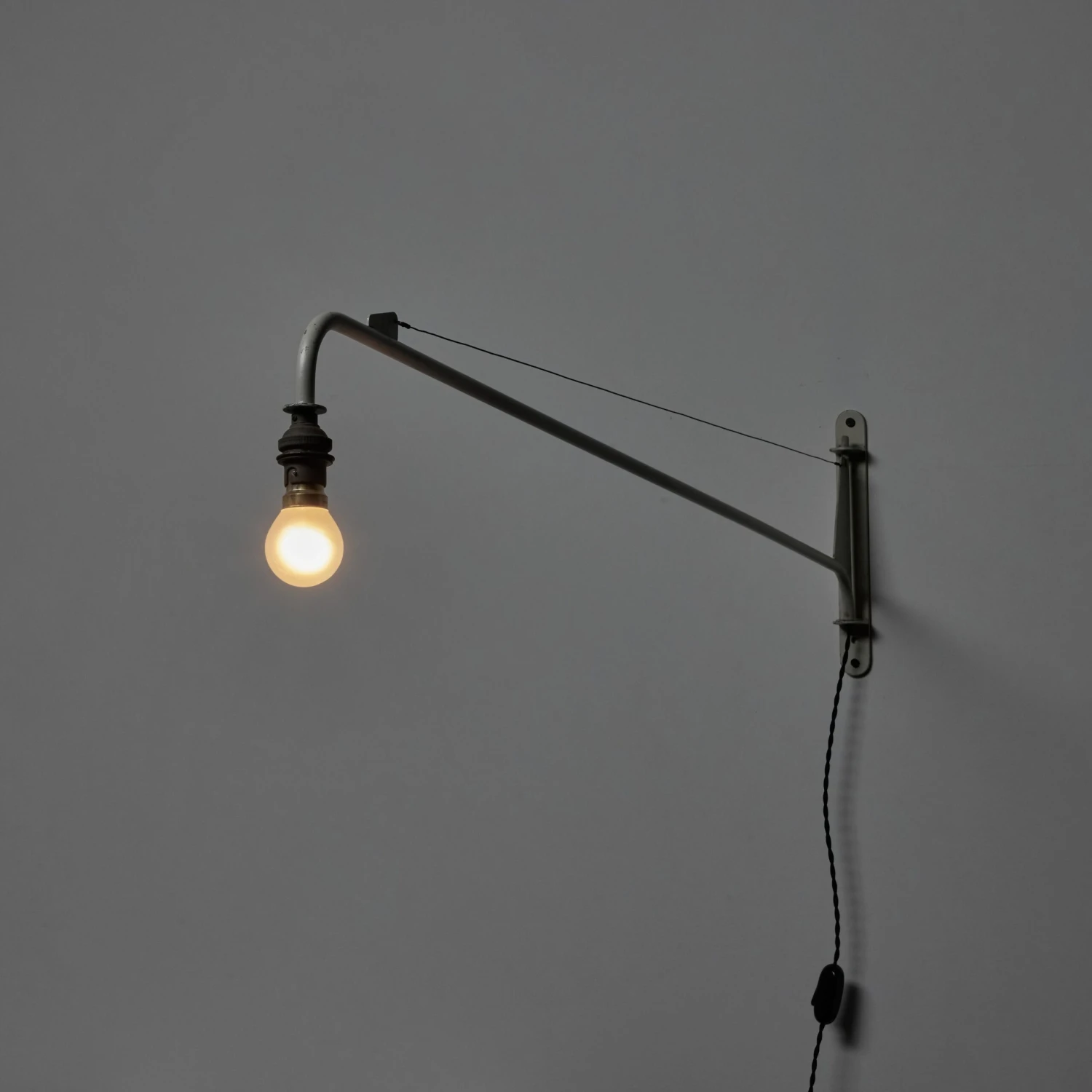 ‘Potence d’Eclairage’ swing jib wall light by Jean Prouve. Designed and manufactured in Italy, circa the 1950s. Truly iconic jib arm wall light by Prouve was at the forefront of the utilitarian swing arm light design. A simple nautical and attractive wall mount construction is displayed in an enameled bone-white finish. The light holds a single bayonet B-22 socket type. We recommend a 20W max b-22 bulb. Bulb provided as a one -time courtesy.