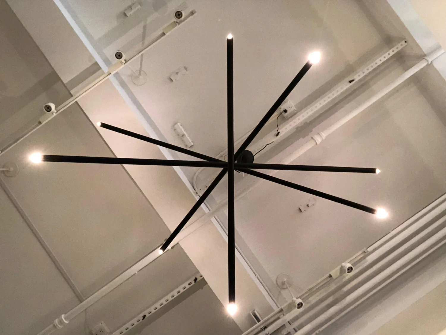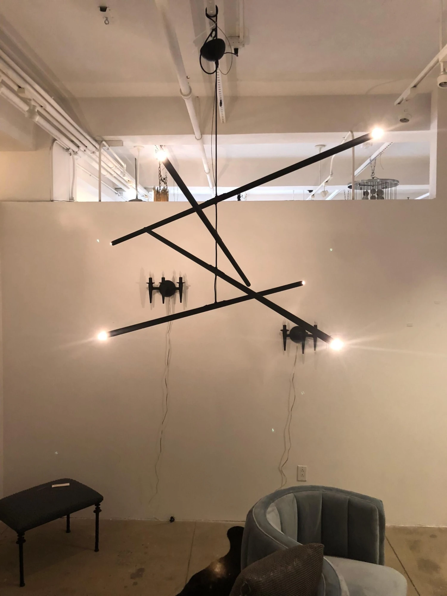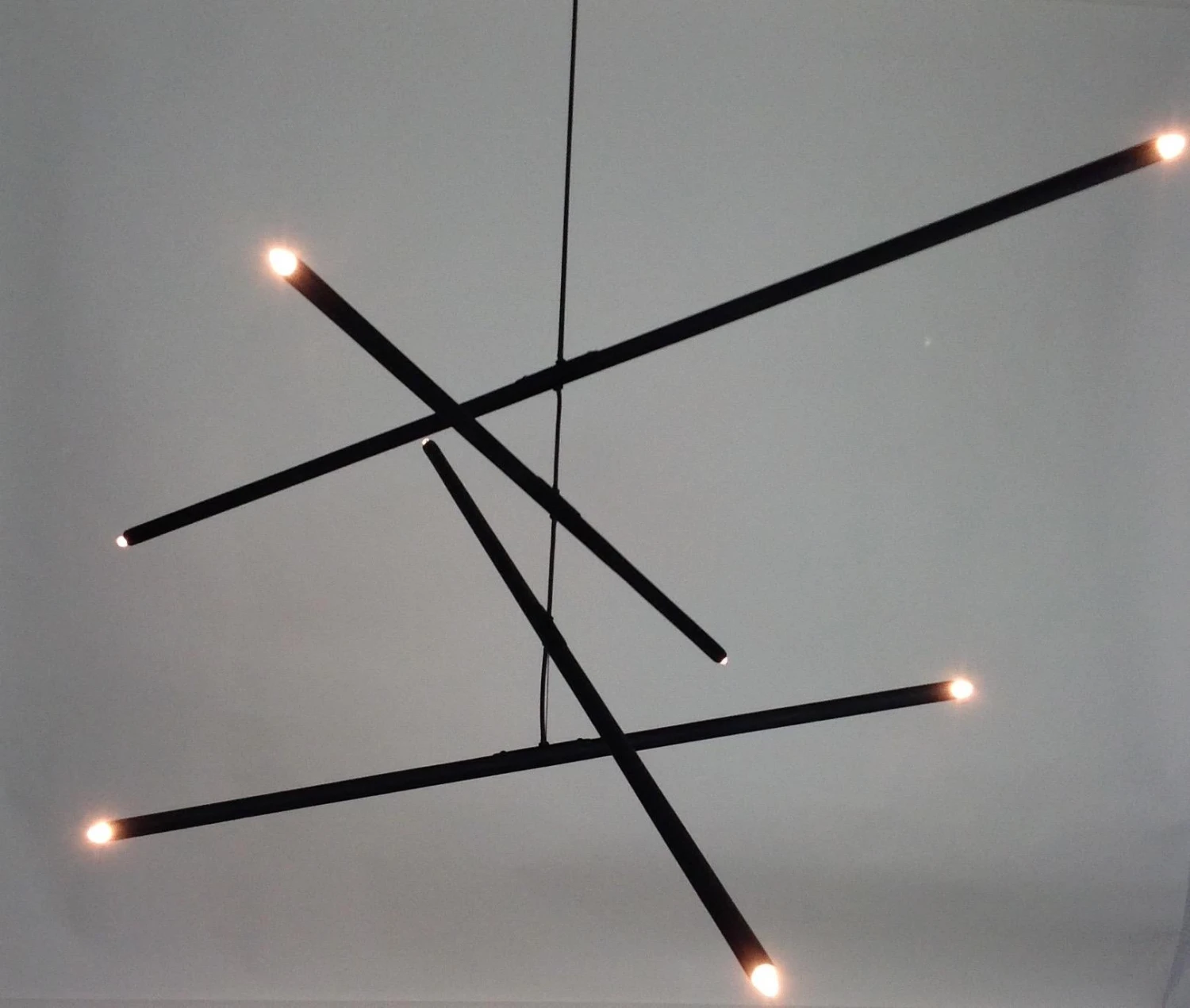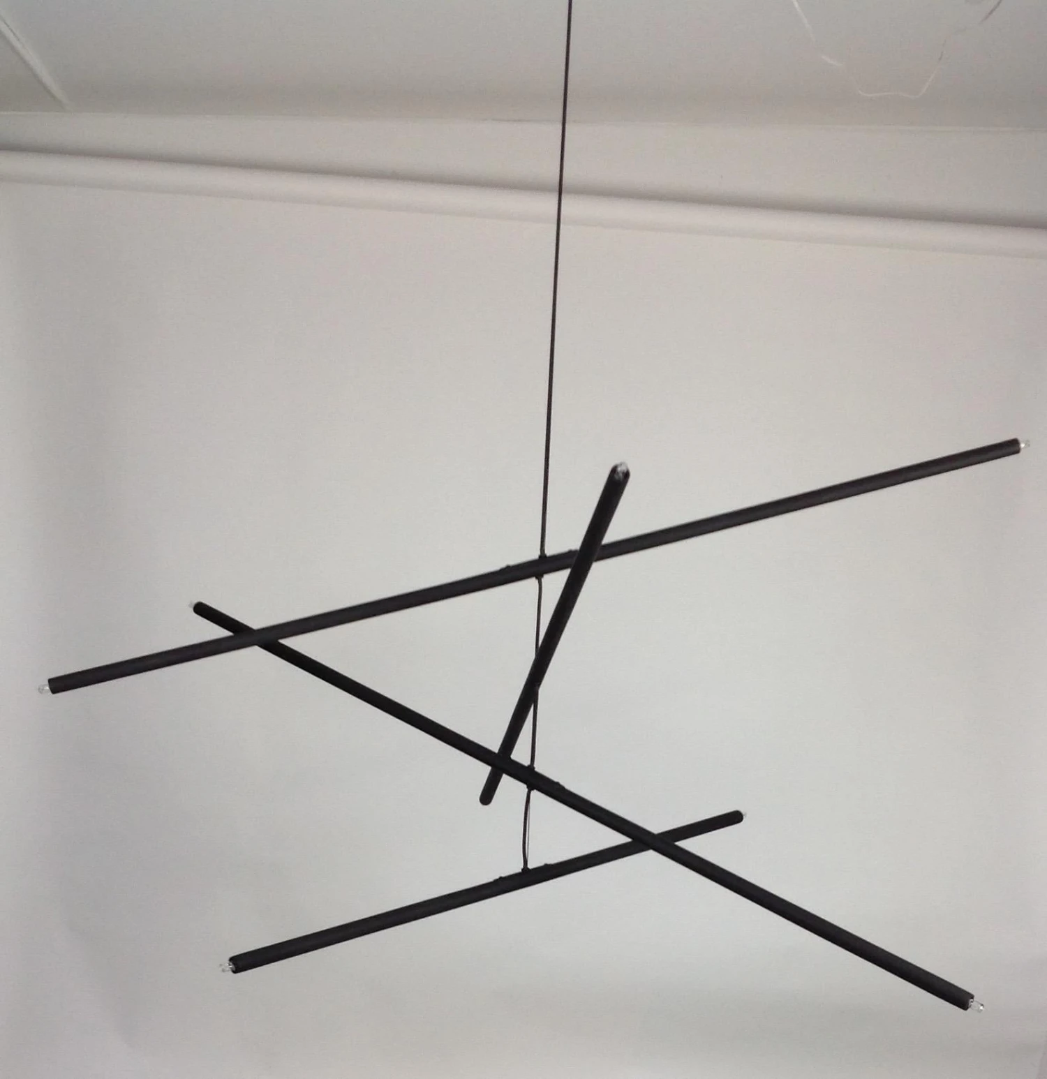This intriguing chandelier floats in the air like a mobile. The hand finished plaster rods are fitted with halogen sockets and are suspended from a silk steel wire. The eight lights provide a perfect Ambience and light the room with a simple elegance. The light can be created custom in drop and length. The light uses eight 120 volt halogen light bulbs G-8 base. Max wattage 20 each. The canopy is created to work on a standard j box. The chandelier has a matte black finish.