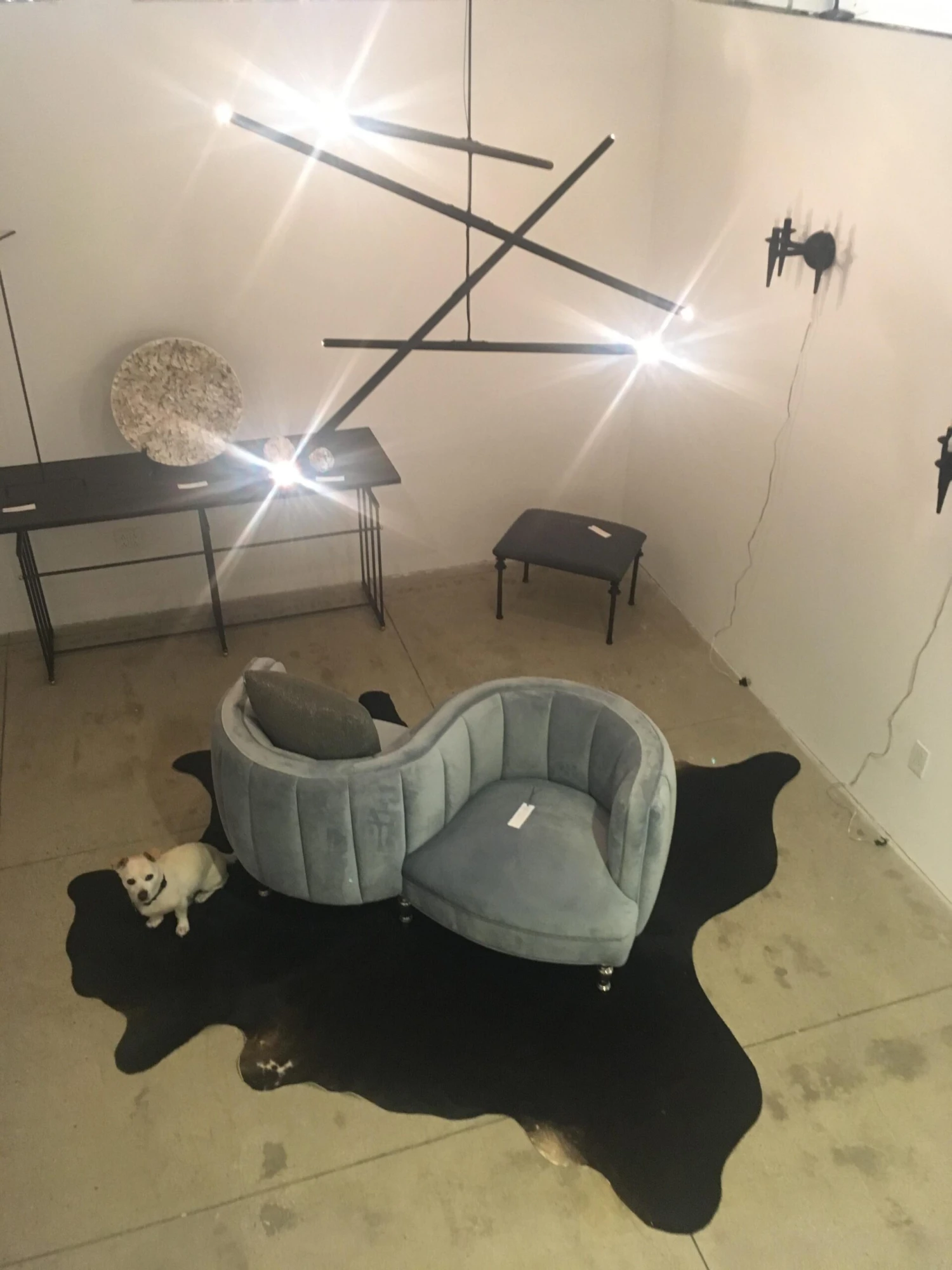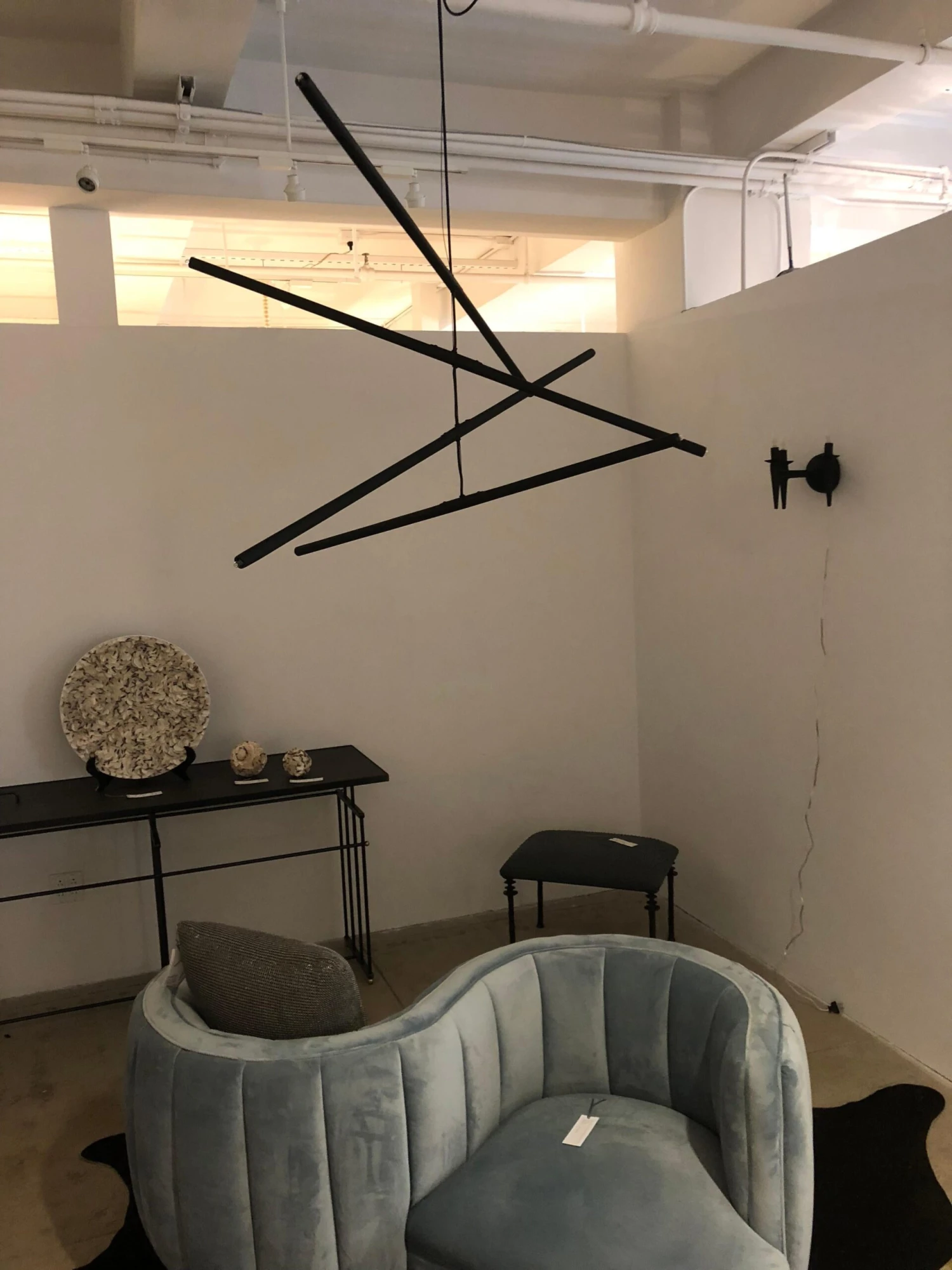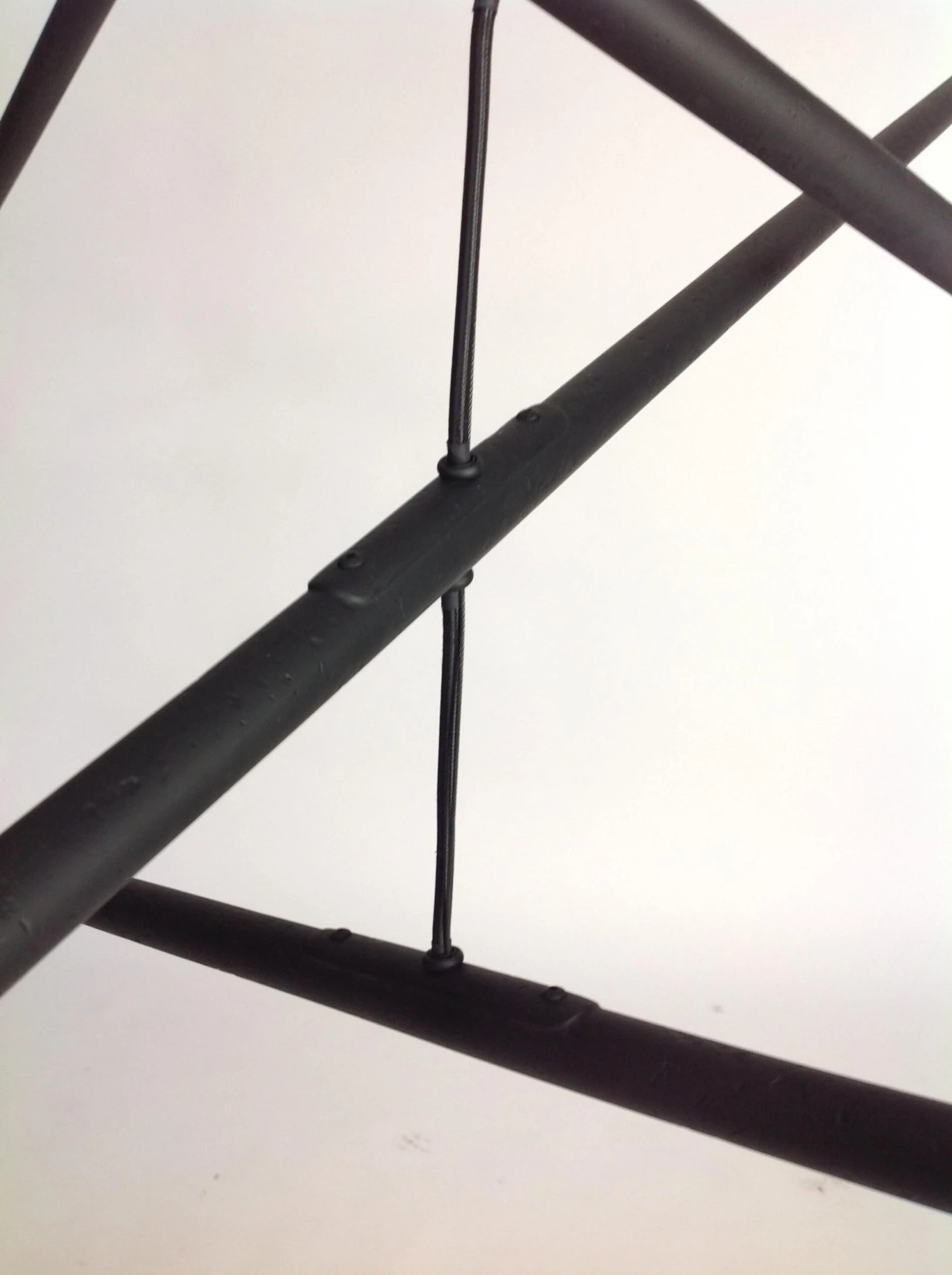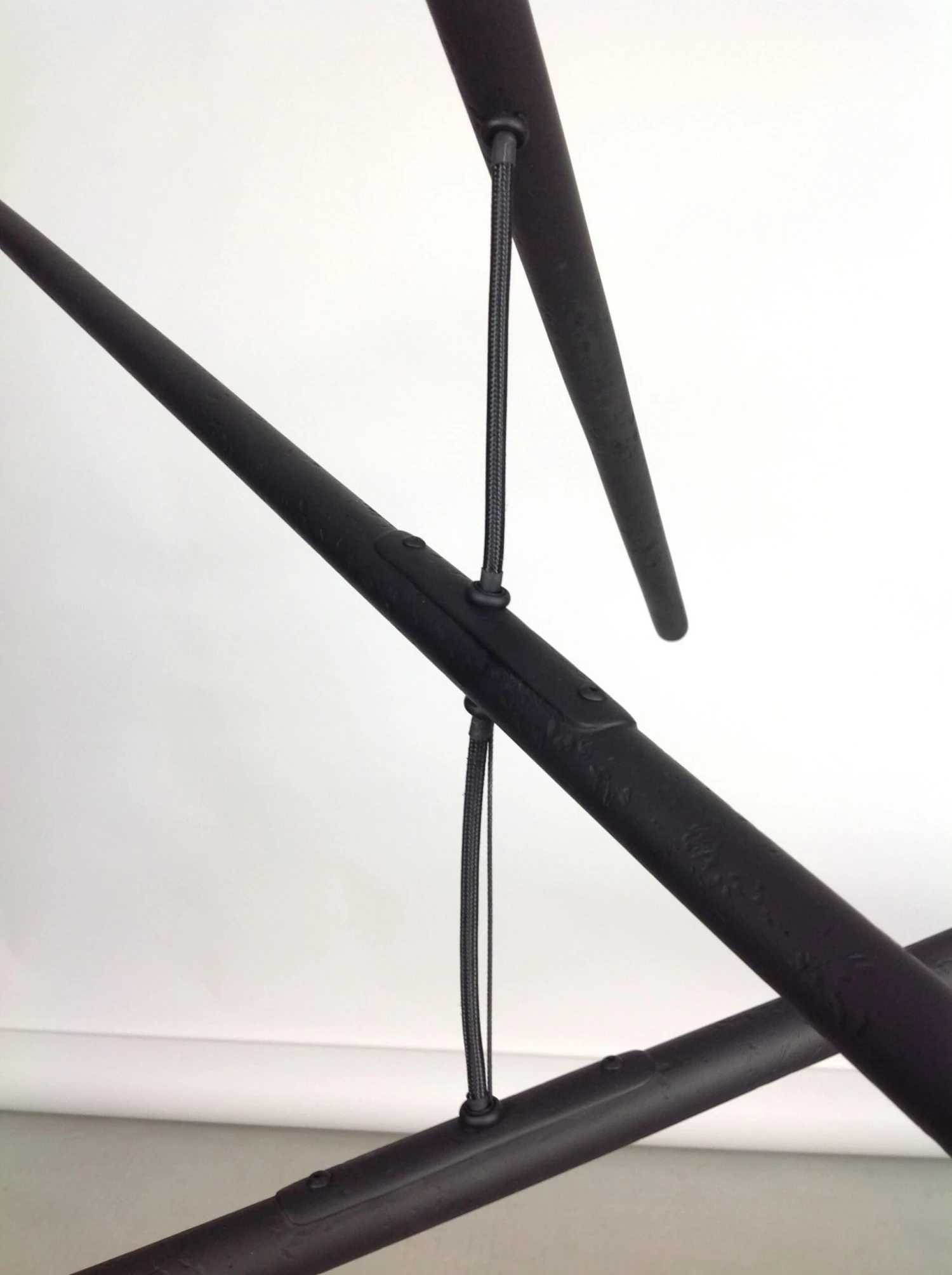 This intriguing chandelier floats in the air like a mobile. The hand finished plaster rods are fitted with halogen sockets and are suspended from a silk steel wire. The eight lights provide a perfect Ambience and light the room with a simple elegance. The light can be created custom in drop and length. The light uses eight 120 volt halogen light bulbs G-8 base. Max wattage 20 each. The canopy is created to work on a standard j box. The chandelier has a matte black finish.