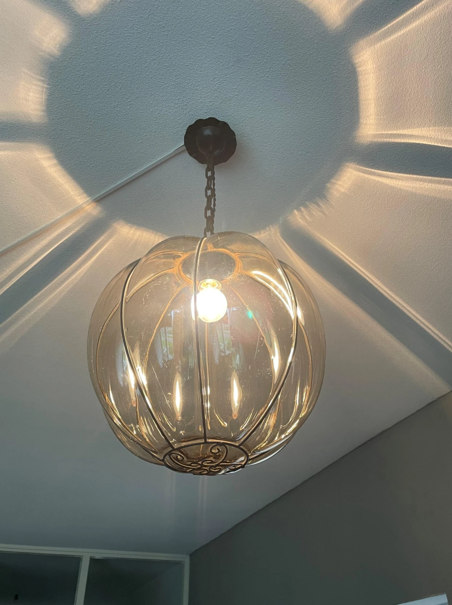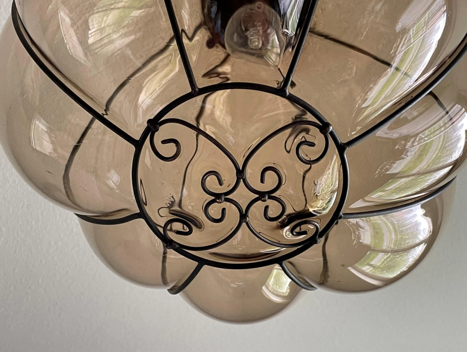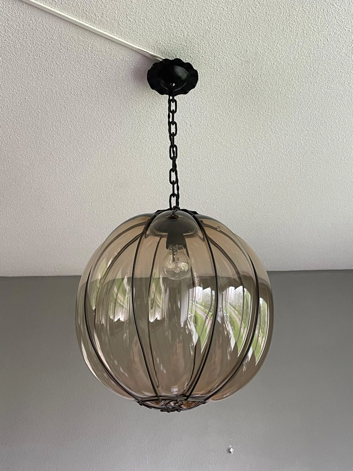 This rare and stylish Murano pendant is beautiful in shape and the smoked glass is perfectly mouthblown into the rare, near-circular, handcrafted metal frame. This rare, globe design even comes with the original Murano chain and the hand-forged and blackened, circular iron canopy (with the hook for easy mounting inside). This unique pendant radiates a warm light, that will bring the perfect ambiance in an entrance or in any other room. Have you also noticed the amazing patterns it creates on your ceiling and walls. We have never seen a globe design and smoked glass, mouthblown Murano pendant and certainly not of this size. What we also have never seen in a Venetian Murano pendant is the unique and organically stylish, hand-crafted metal element at the bottom. It is this rare element that convinces us that this rare light fixture can only have been made by one of the famous glass studios. We don’t have the books/literature to be able to find out which studio that must have been. There is one unfortunate thing about this rare pendant and that is the reason why we are asking less than half (!) of what this light would be worth if it were in perfect condition. When the light is switched on and especially when looking at this pendant at eye-level, several small and superficial scratches appear on the outside of almost all bulging glass sections (but only in the middle). The higher up this light is mounted, the less visible they seem to become. When the light is not on, you cannot see these superficial scratches at all (as you can see in our photos). This unique and relatively large size pendant will be professionally rewired to the highest standard for safe and immediate use in the U.S.A. as well and you will be able to use one regular American E26 bulb of up to 100watts. Thanks to the metal hook inside the canopy, mounting this light is child’s play.