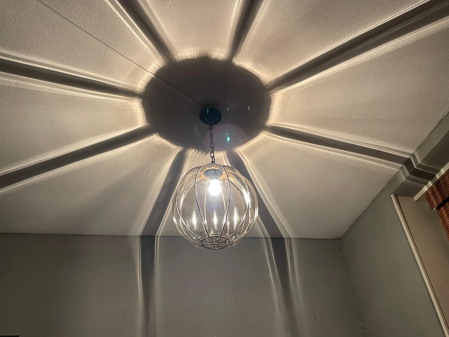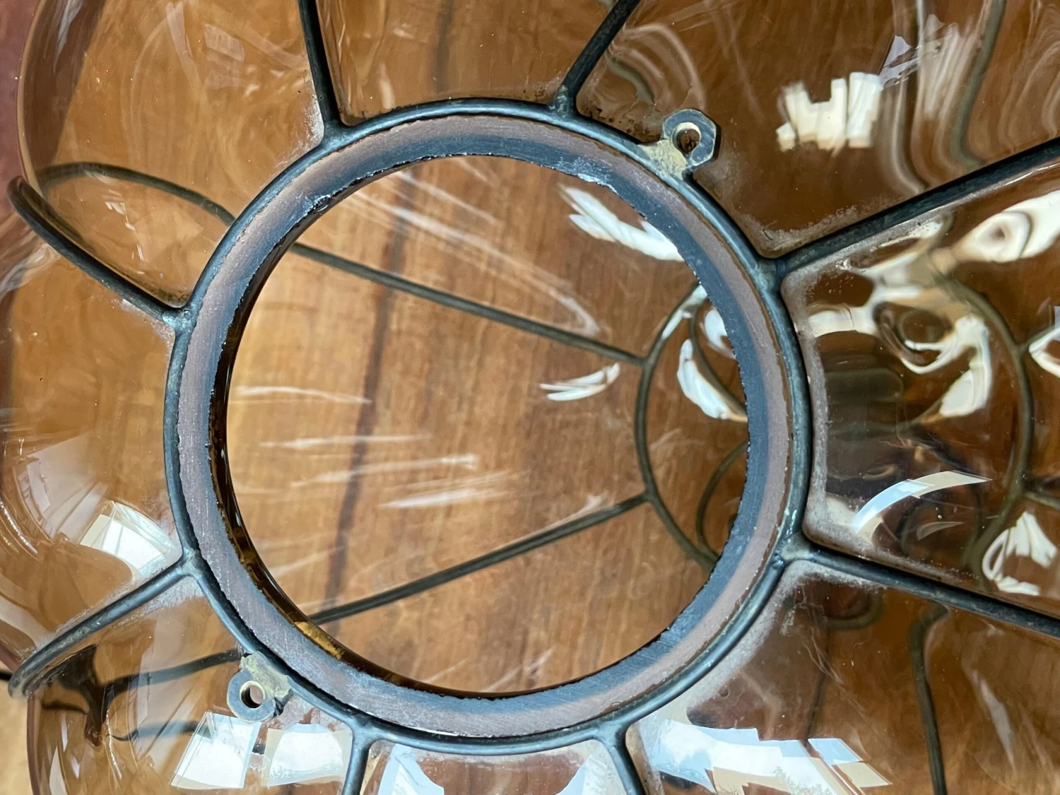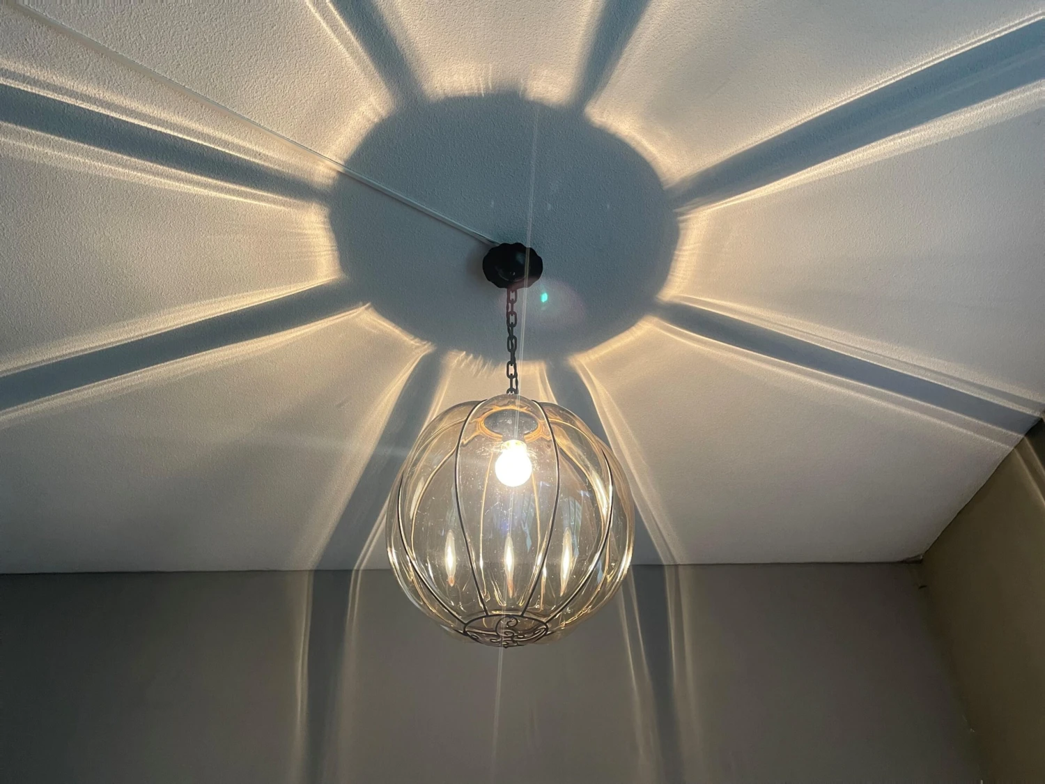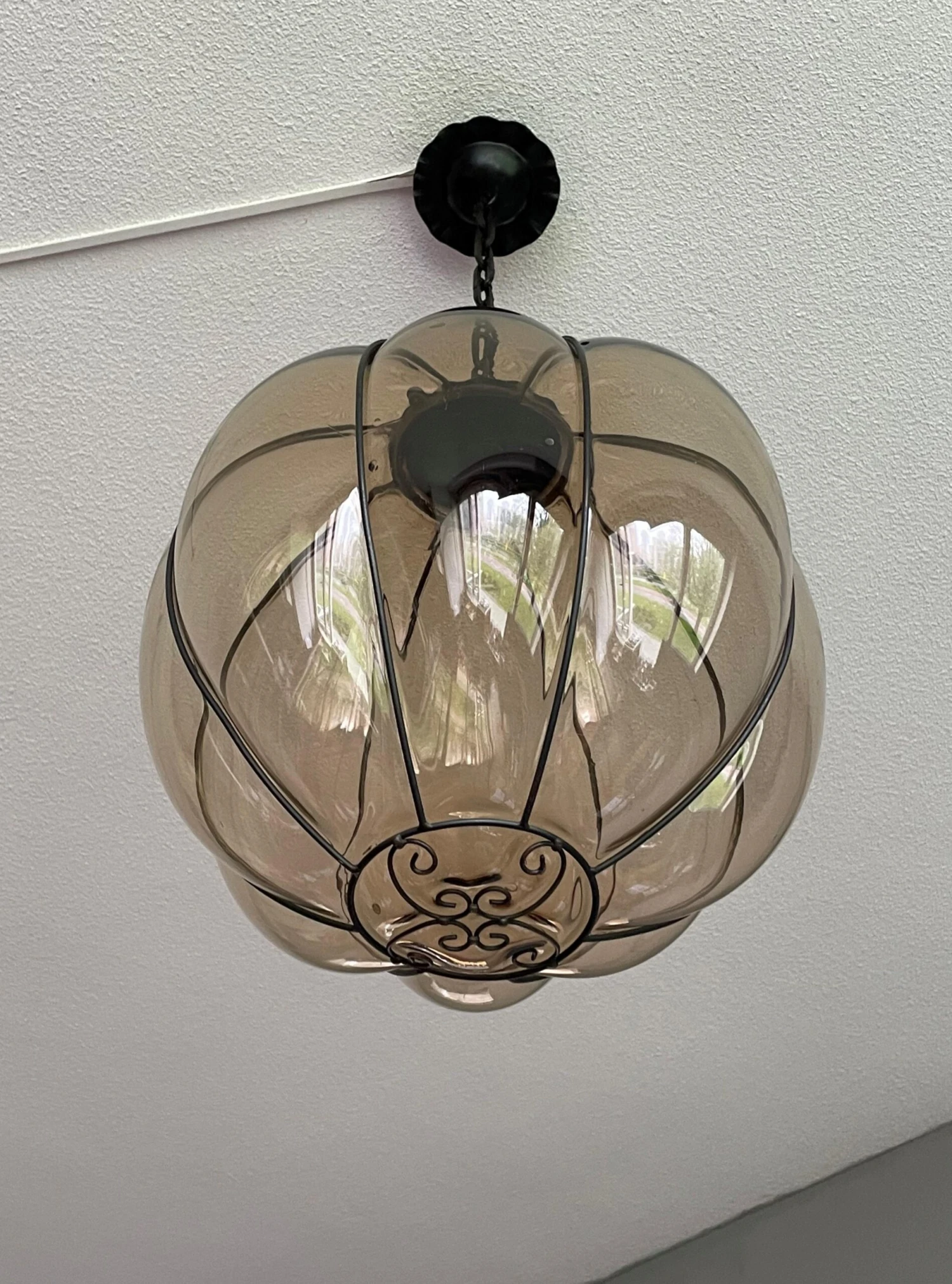 This rare and stylish Murano pendant is beautiful in shape and the smoked glass is perfectly mouthblown into the rare, near-circular, handcrafted metal frame. This rare, globe design even comes with the original Murano chain and the hand-forged and blackened, circular iron canopy (with the hook for easy mounting inside). This unique pendant radiates a warm light, that will bring the perfect ambiance in an entrance or in any other room. Have you also noticed the amazing patterns it creates on your ceiling and walls. We have never seen a globe design and smoked glass, mouthblown Murano pendant and certainly not of this size. What we also have never seen in a Venetian Murano pendant is the unique and organically stylish, hand-crafted metal element at the bottom. It is this rare element that convinces us that this rare light fixture can only have been made by one of the famous glass studios. We don’t have the books/literature to be able to find out which studio that must have been. There is one unfortunate thing about this rare pendant and that is the reason why we are asking less than half (!) of what this light would be worth if it were in perfect condition. When the light is switched on and especially when looking at this pendant at eye-level, several small and superficial scratches appear on the outside of almost all bulging glass sections (but only in the middle). The higher up this light is mounted, the less visible they seem to become. When the light is not on, you cannot see these superficial scratches at all (as you can see in our photos). This unique and relatively large size pendant will be professionally rewired to the highest standard for safe and immediate use in the U.S.A. as well and you will be able to use one regular American E26 bulb of up to 100watts. Thanks to the metal hook inside the canopy, mounting this light is child’s play.