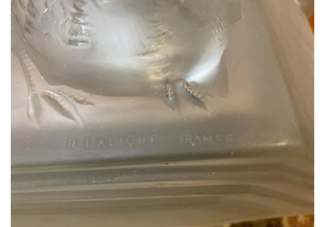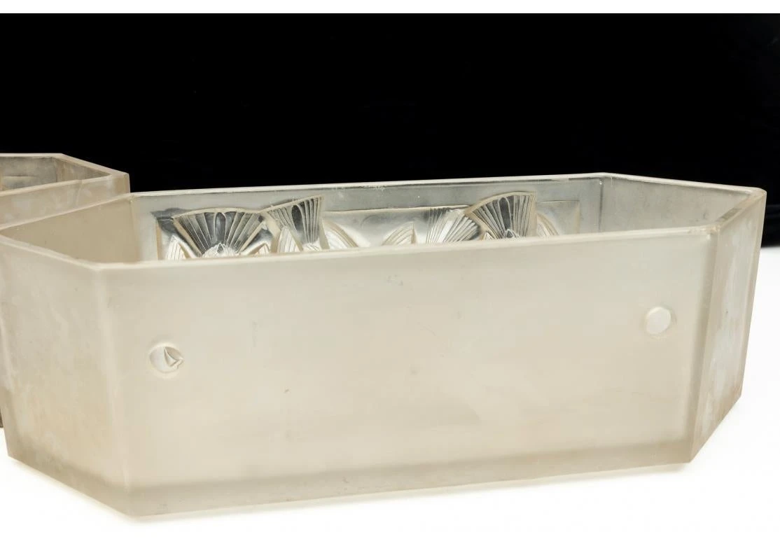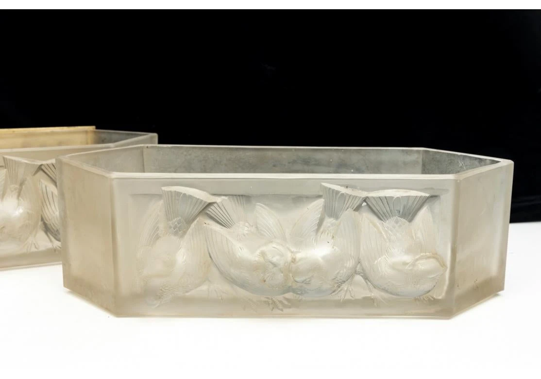 Pair of rare Rene Lalique Art Deco frosted and clear glass wall sconces with relief sparrow birds. Embossed signature R. Lalique lower right. Bronze rectangular backplate.