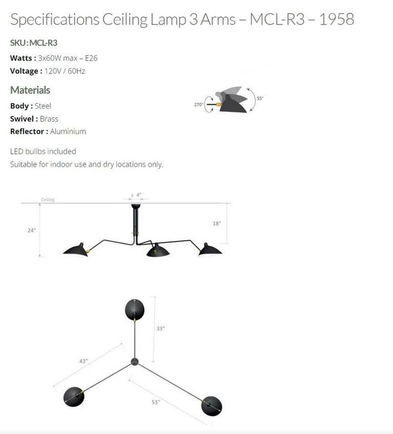 Simple and elegant, this ceiling lamp makes a dramatic addition to a variety of room settings. With three rotating arms of differing lengths and heads that swivel and tilt, this lamp is capable of projecting light upwards, downwards.