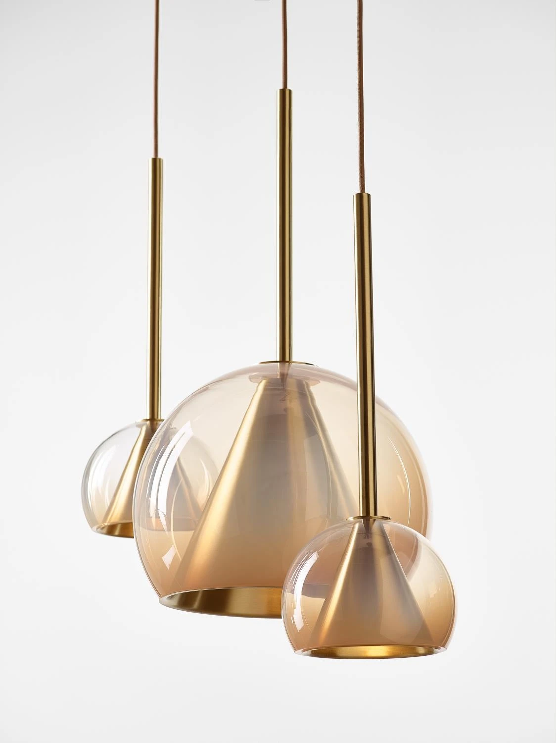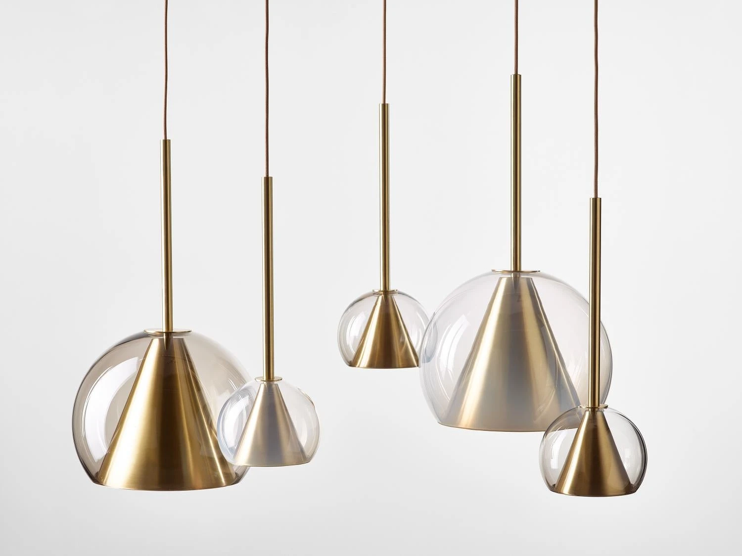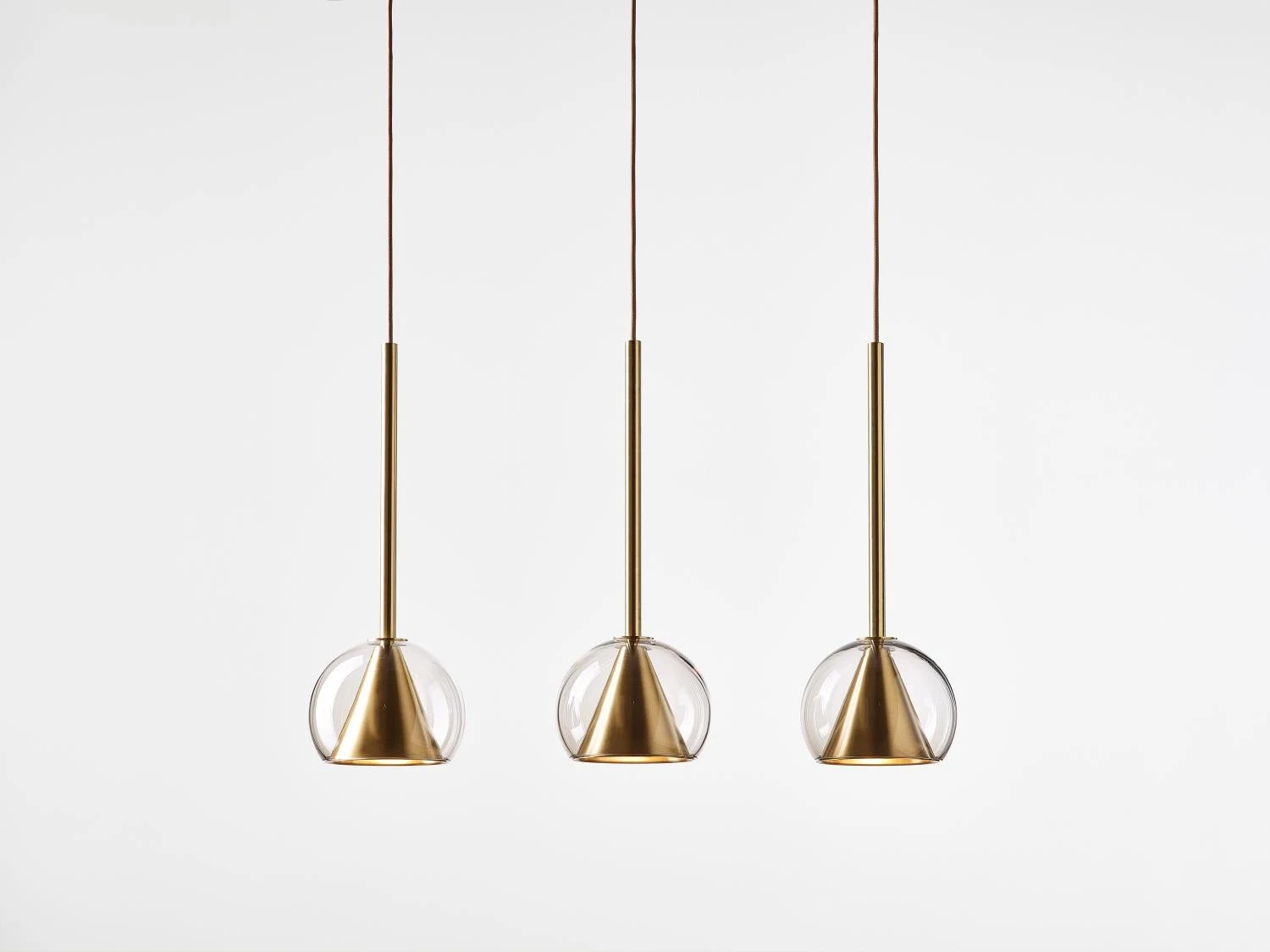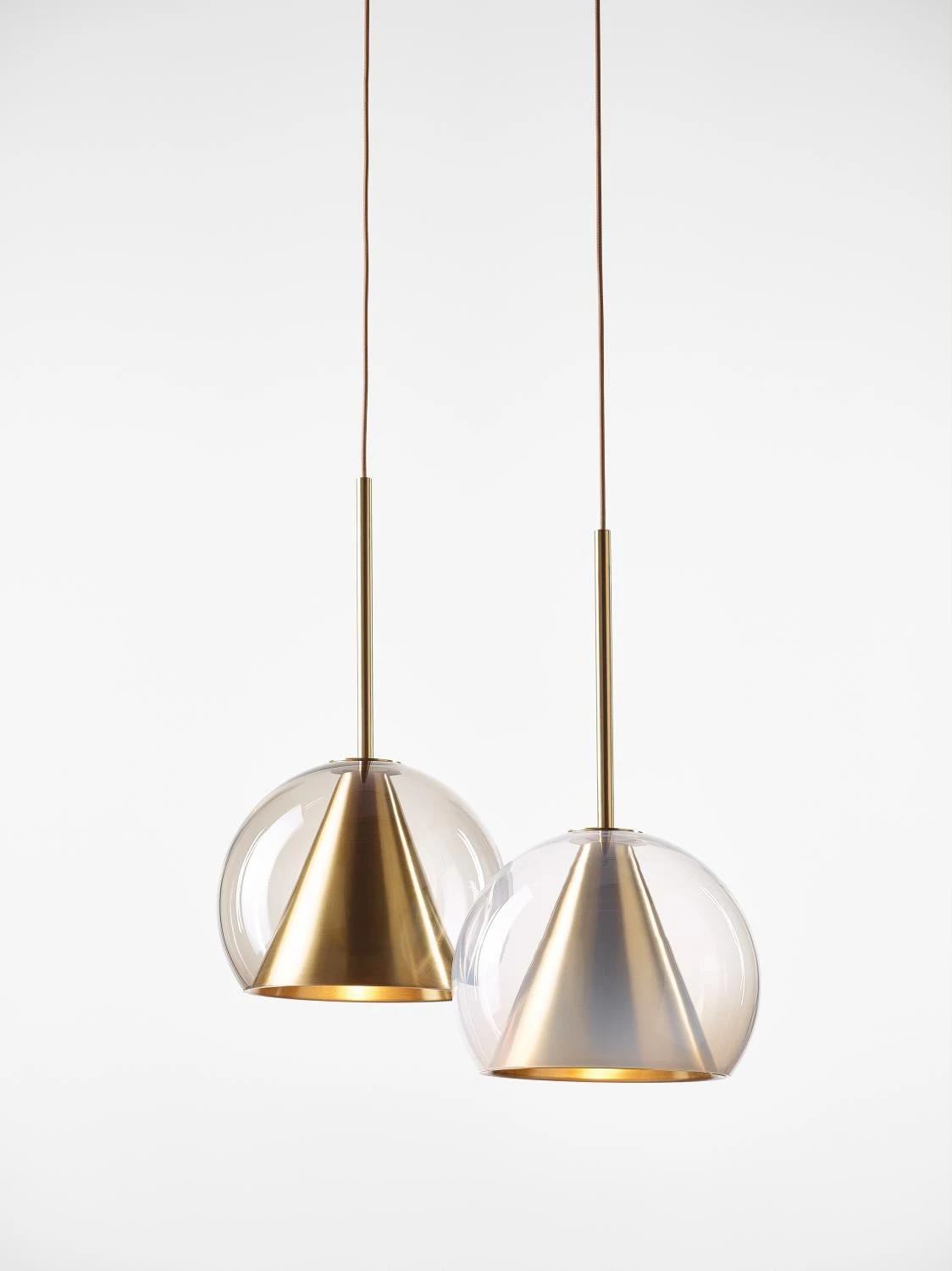 This collection of suspended light fixtures combines the elementary geometric shapes of a hand-blown glass ball and a brass cone inside, creating an almost metaphysical composition. The glass shades are available in crystal clear, alabaster white, smoke grey and neutral nude. The lamp is suspended on a brushed brass fixture with a textile covered cable.