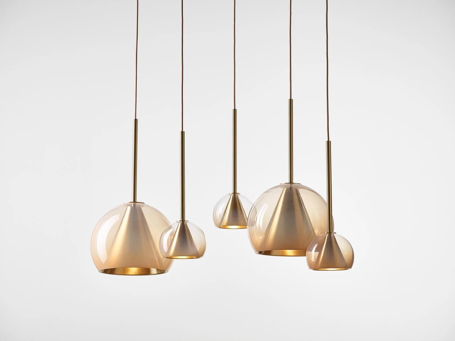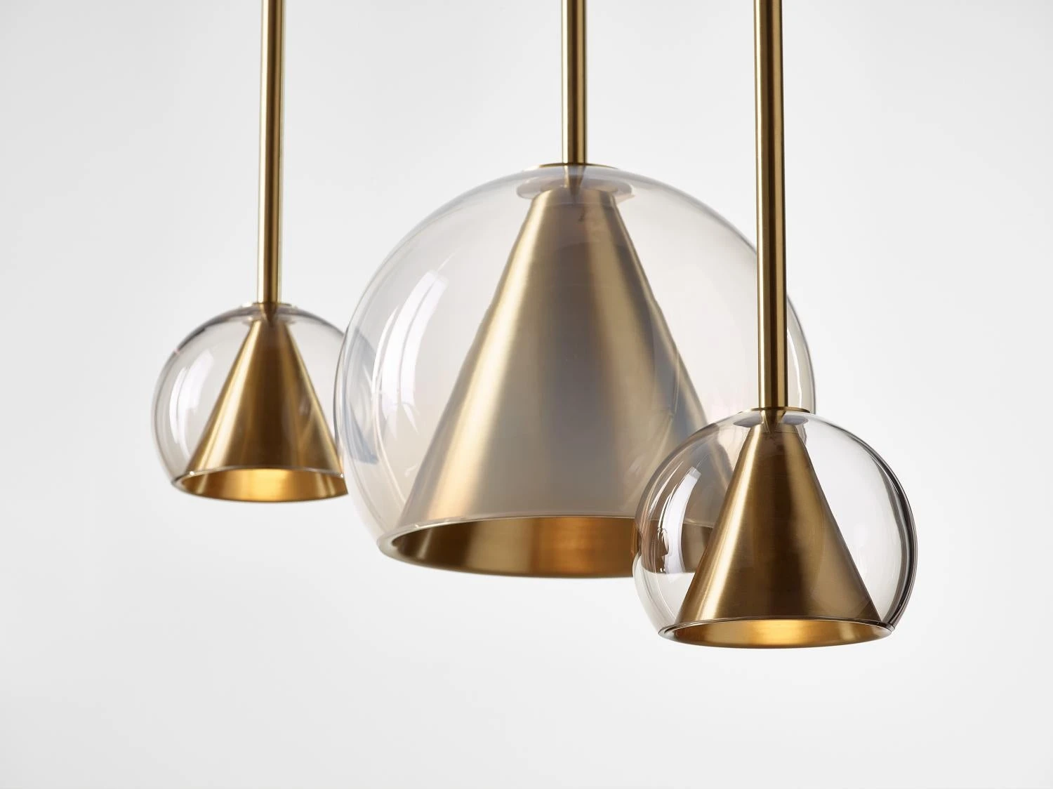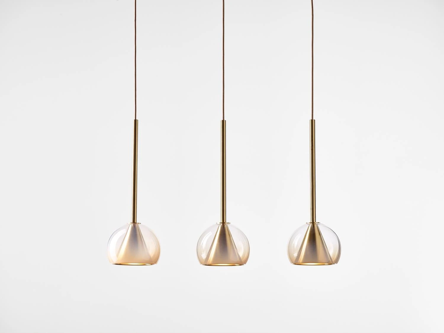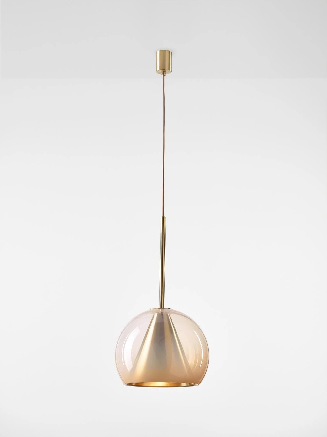 This collection of suspended light fixtures combines the elementary geometric shapes of a hand-blown glass ball and a brass cone inside, creating an almost metaphysical composition. The glass shades are available in crystal clear, alabaster white, smoke grey and neutral nude. The lamp is suspended on a brushed brass fixture with a textile covered cable.