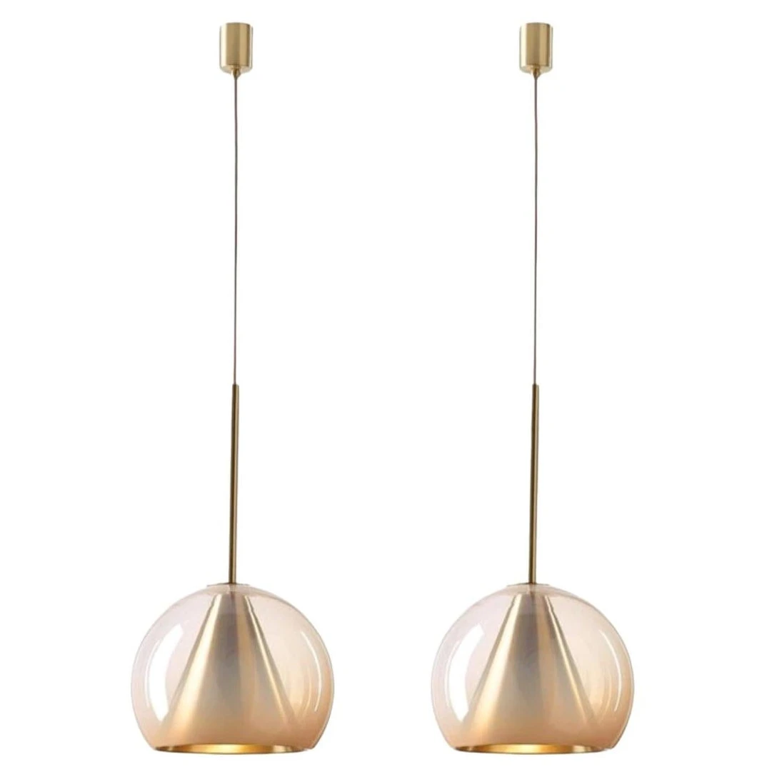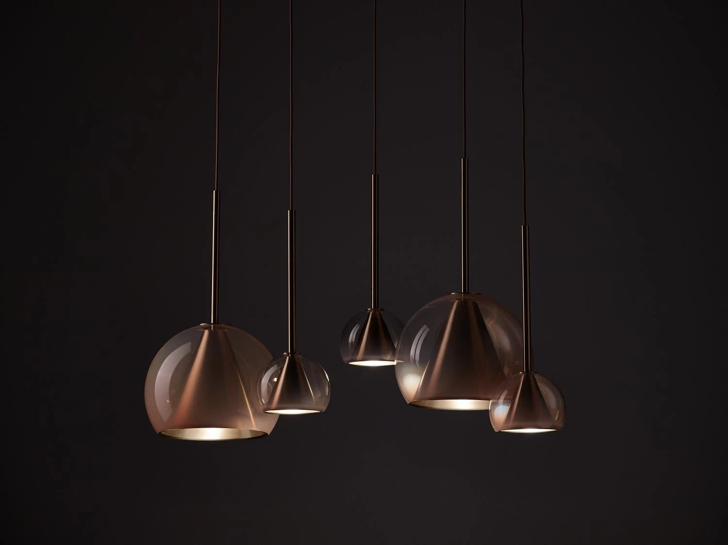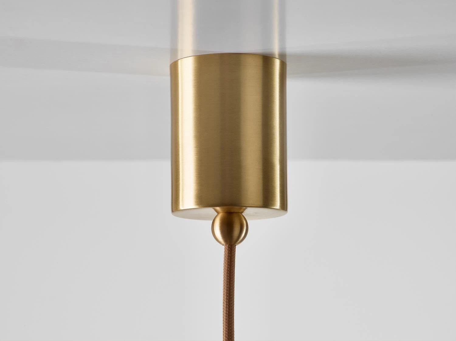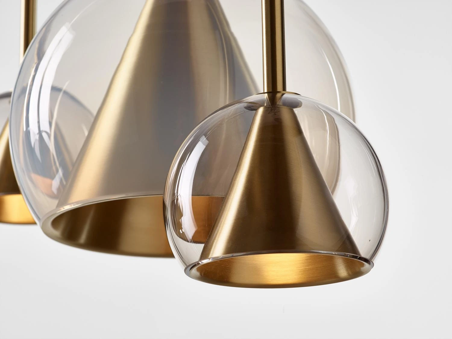 This collection of suspended light fixtures combines the elementary geometric shapes of a hand-blown glass ball and a brass cone inside, creating an almost metaphysical composition. The glass shades are available in crystal clear, alabaster white, smoke grey and neutral nude. The lamp is suspended on a brushed brass fixture with a textile covered cable.