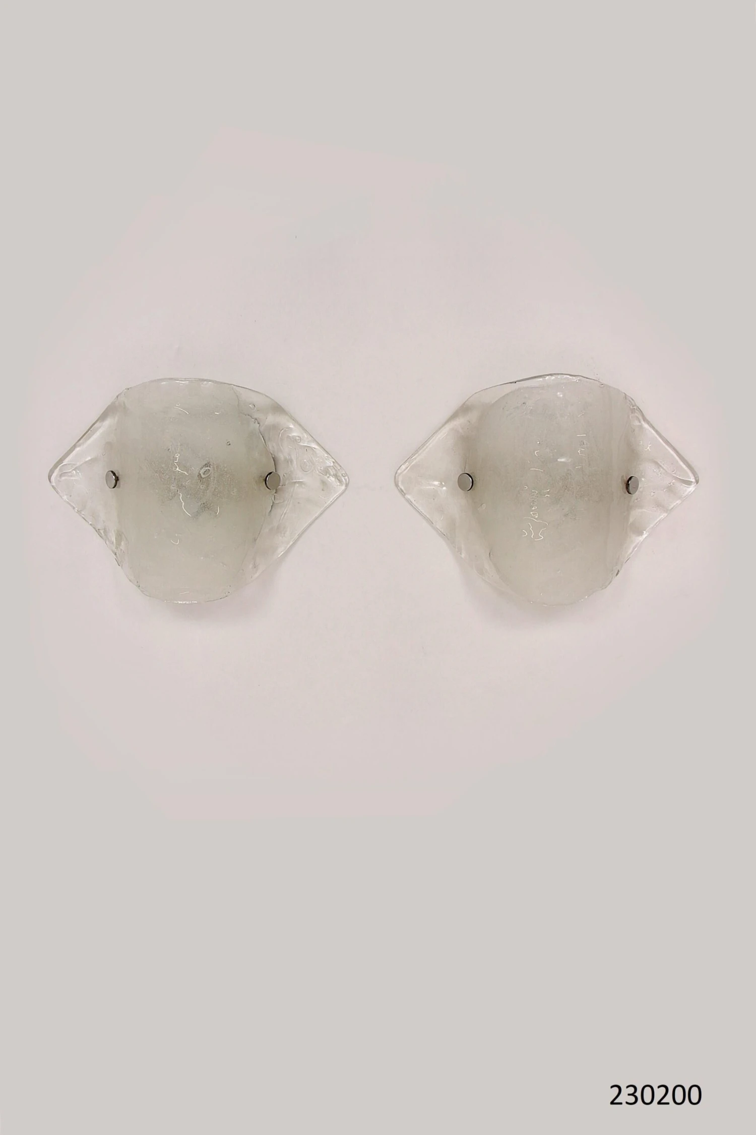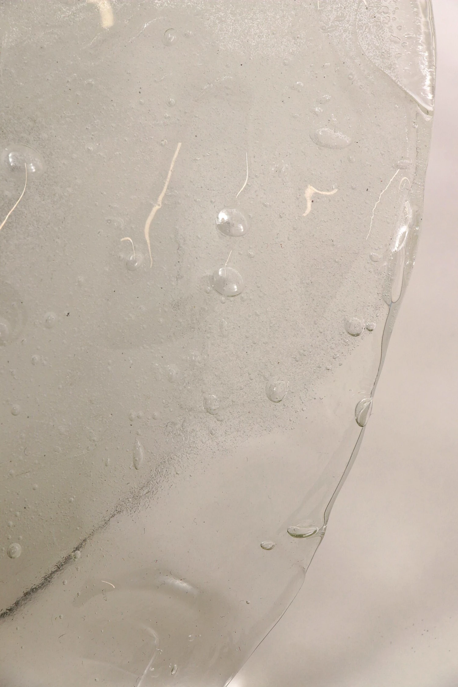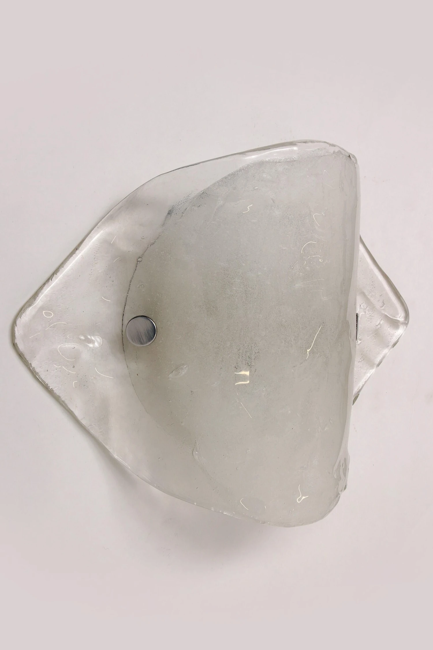 A white painted metal back plate holds an organic hand blown and opal clear bubble glass.
