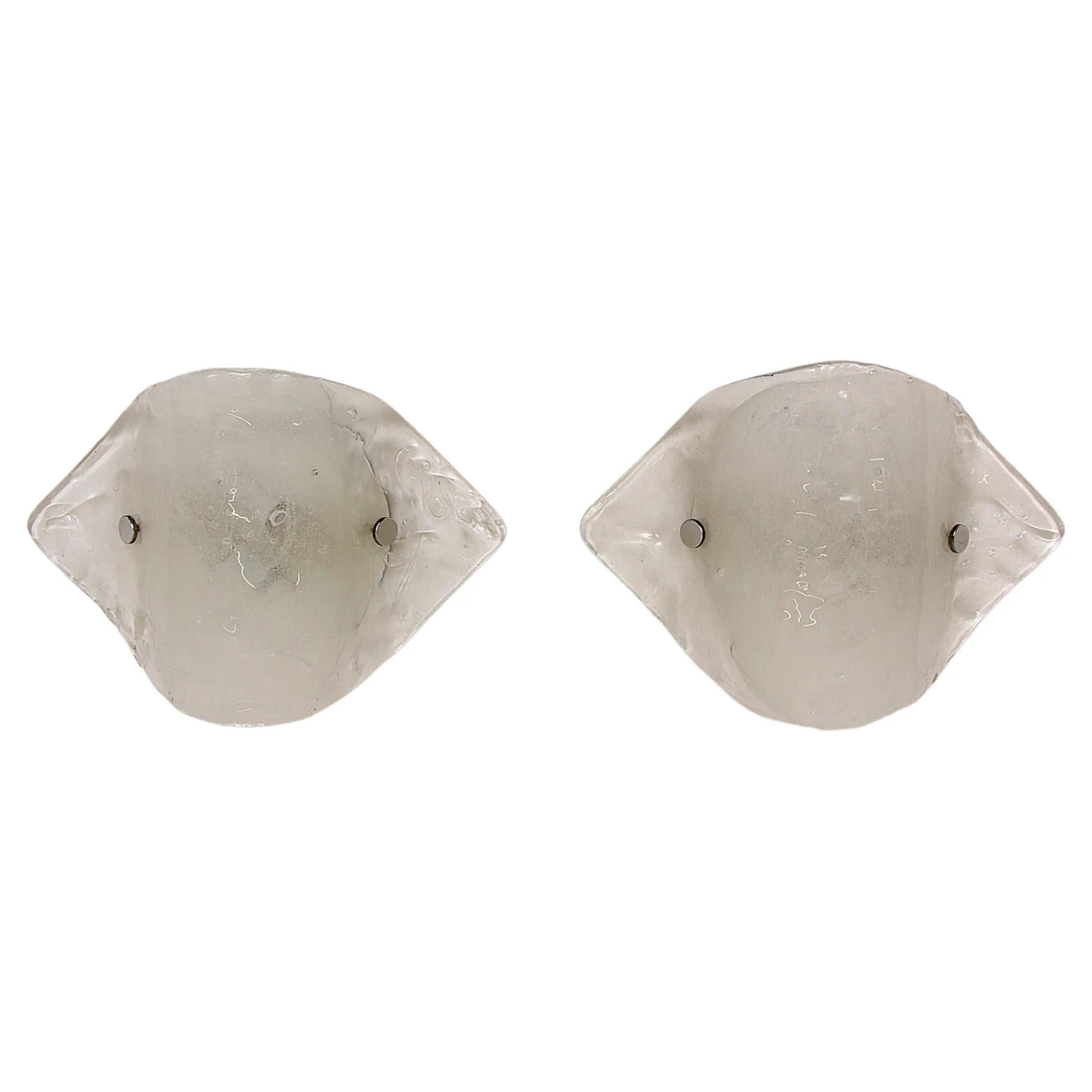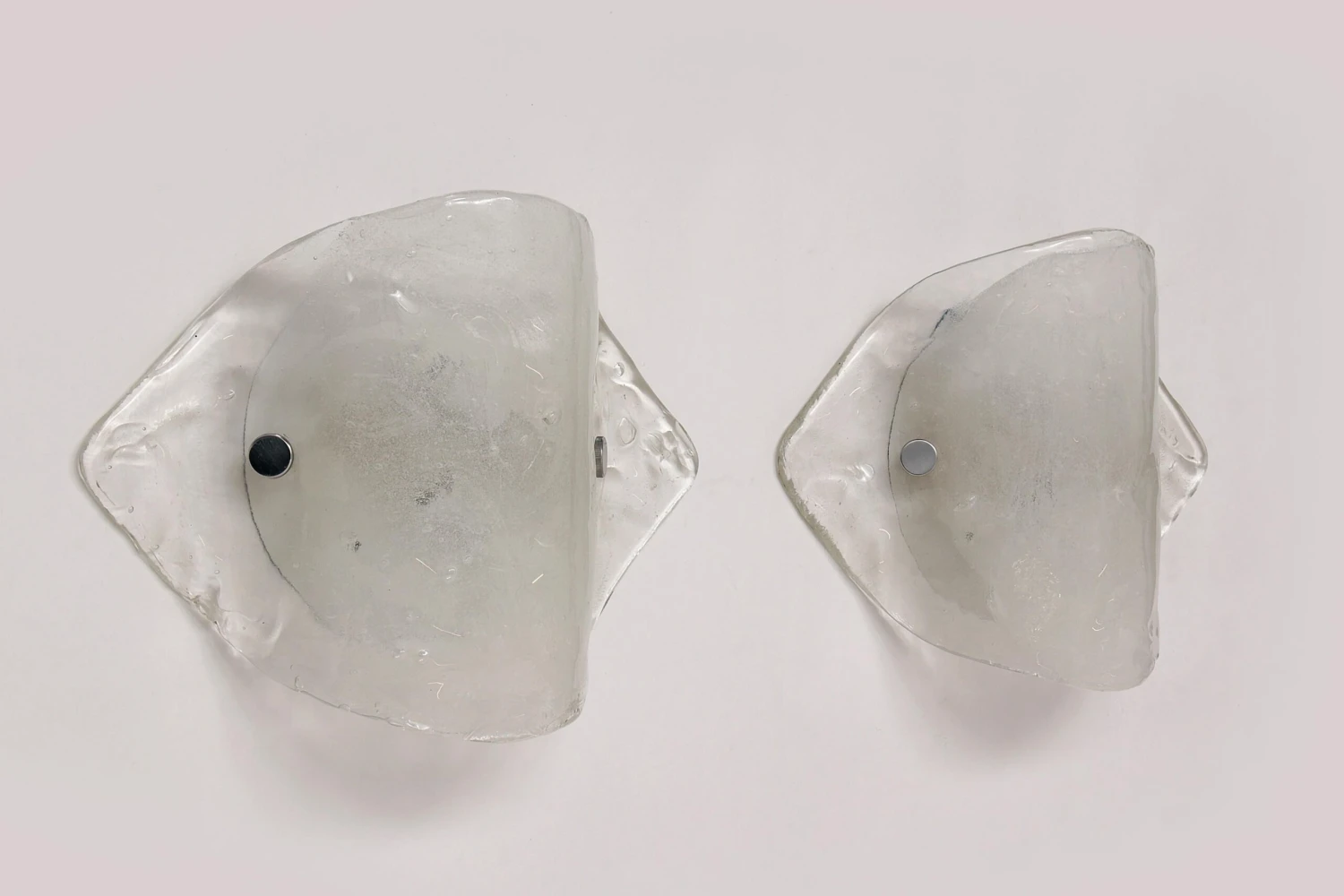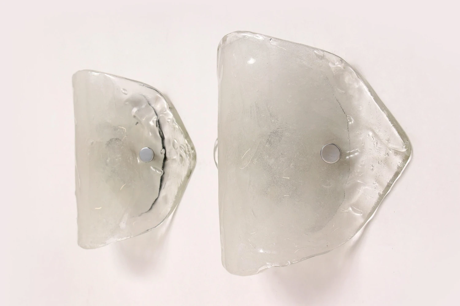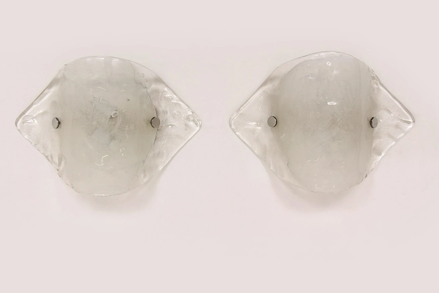 A white painted metal back plate holds an organic hand blown and opal clear bubble glass.