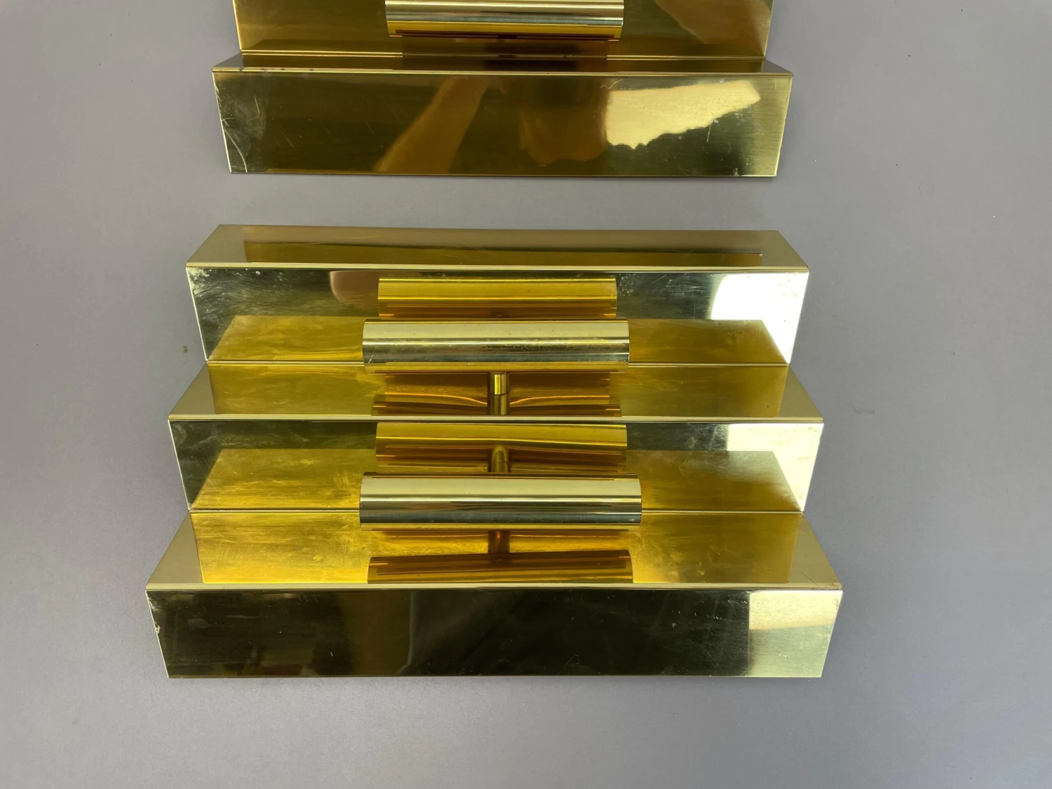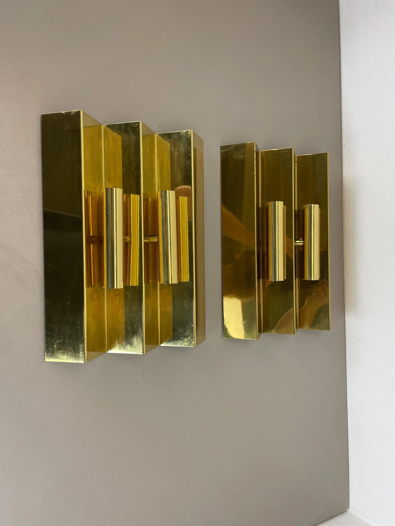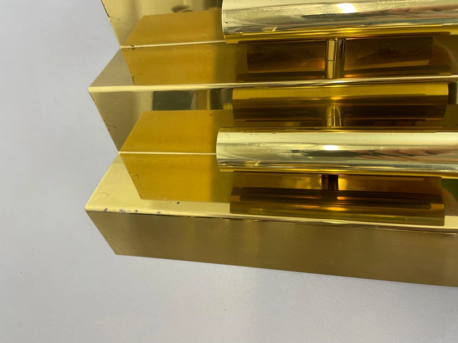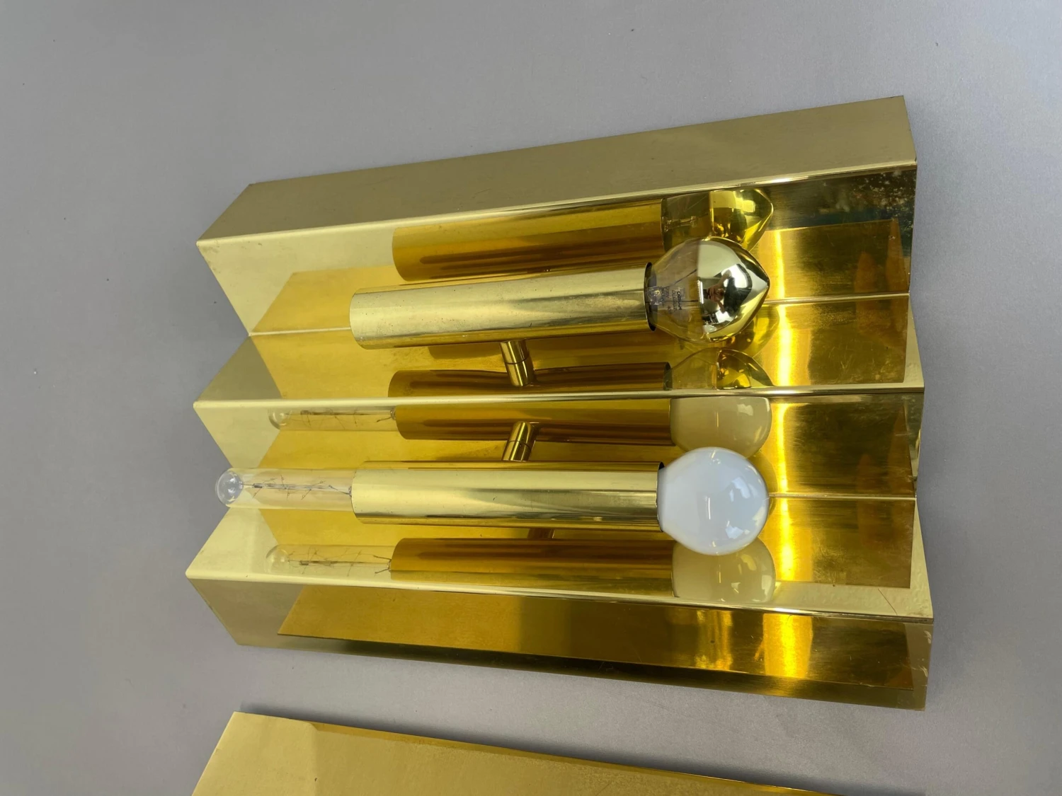 This modernist light set was produced in Germany in the 1970s by WKR Leuchten. It is made from solid brass with 4 light sources on each light. the light element do have a nice cubic form and with 2 bulbs to the top and down. The backside plate has a nice unique cubic form. Minimalist design of the 1970s design era. This wonderful and rare light has 4 socket each for e 14 bulbs. The light looks very impressive in its size of 34cm in height and 25,5cm in length.