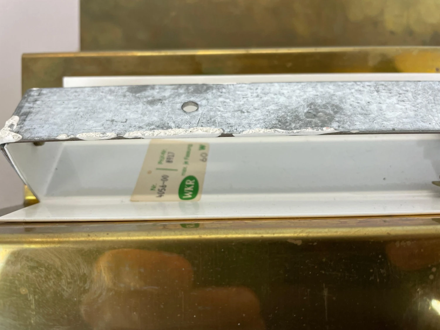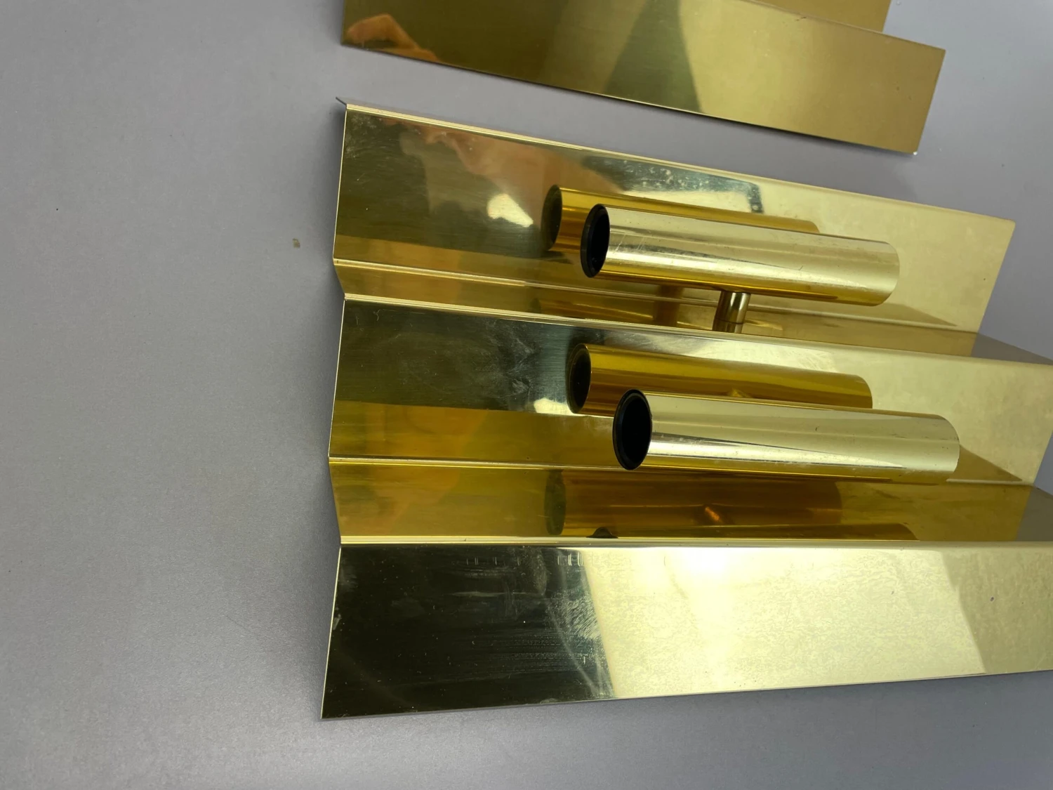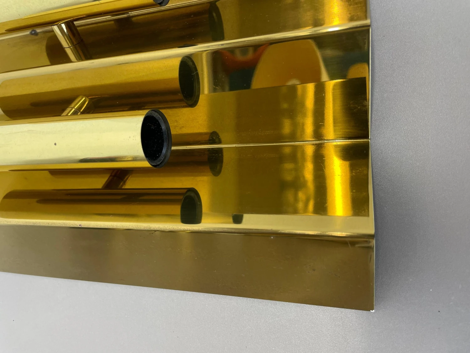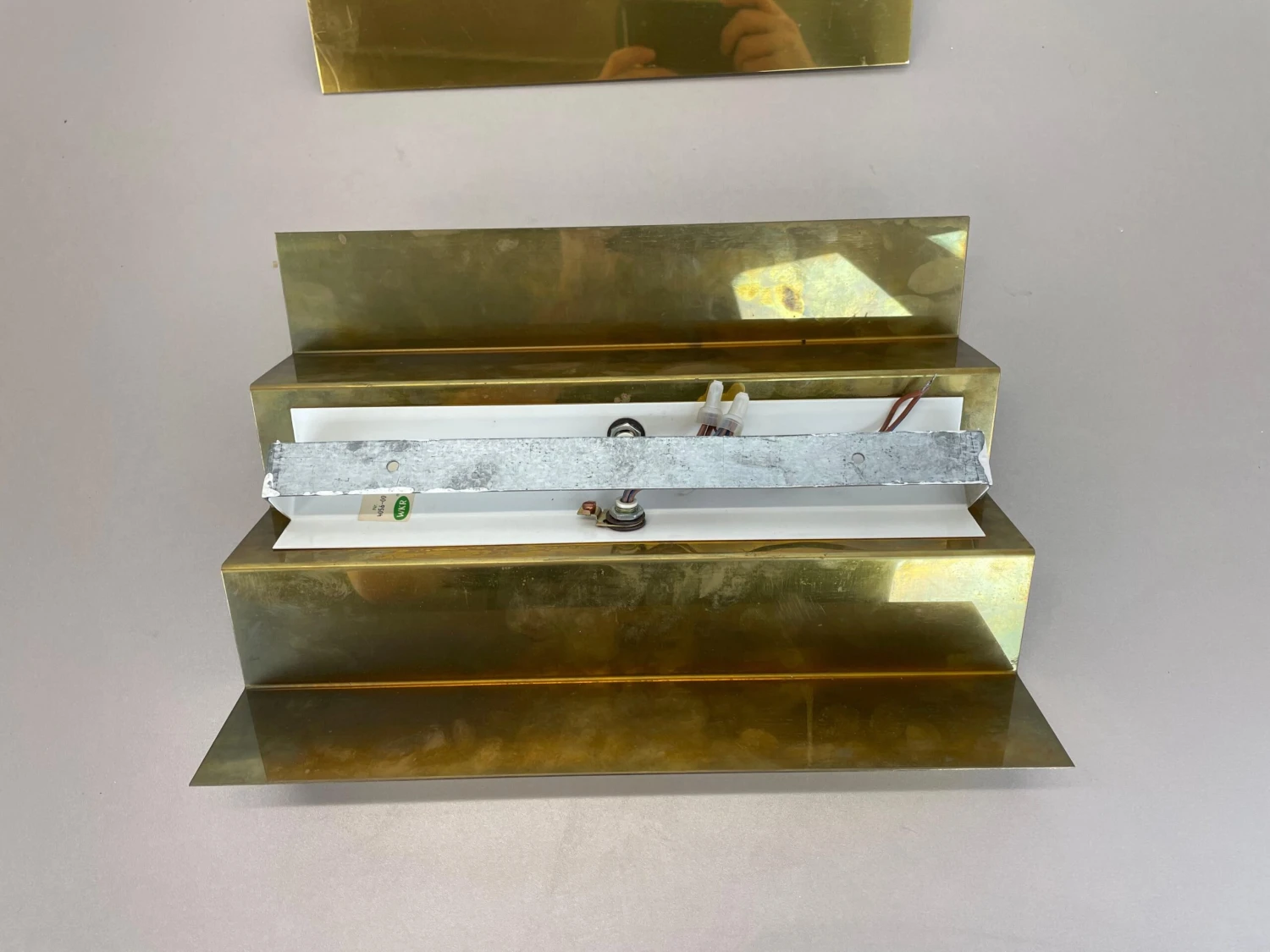 This modernist light set was produced in Germany in the 1970s by WKR Leuchten. It is made from solid brass with 4 light sources on each light. the light element do have a nice cubic form and with 2 bulbs to the top and down. The backside plate has a nice unique cubic form. Minimalist design of the 1970s design era. This wonderful and rare light has 4 socket each for e 14 bulbs. The light looks very impressive in its size of 34cm in height and 25,5cm in length.