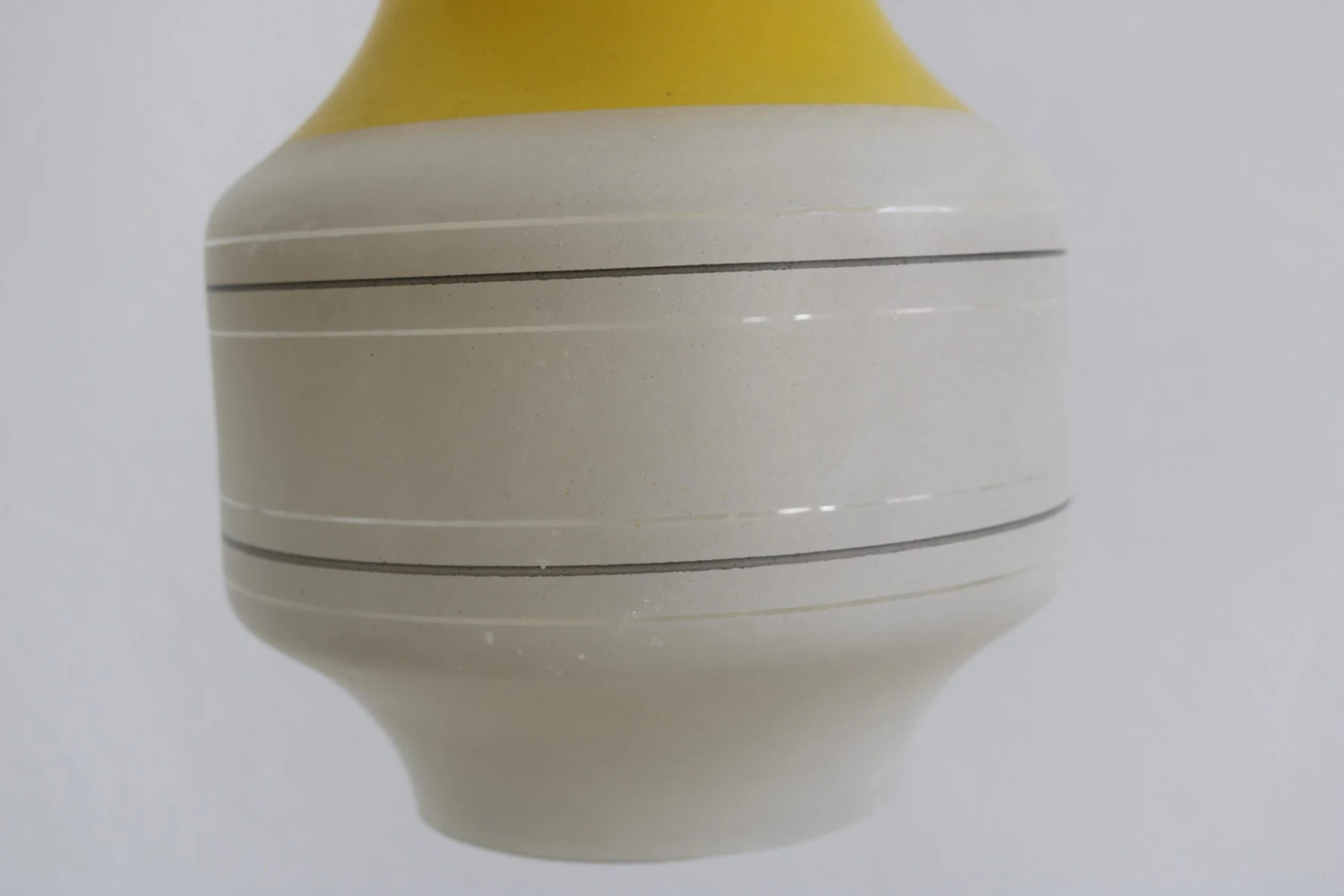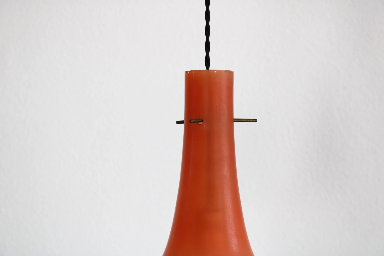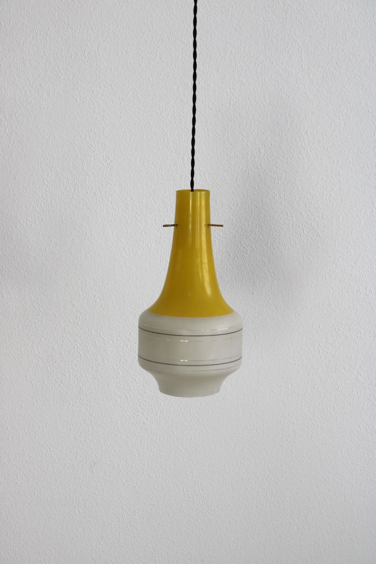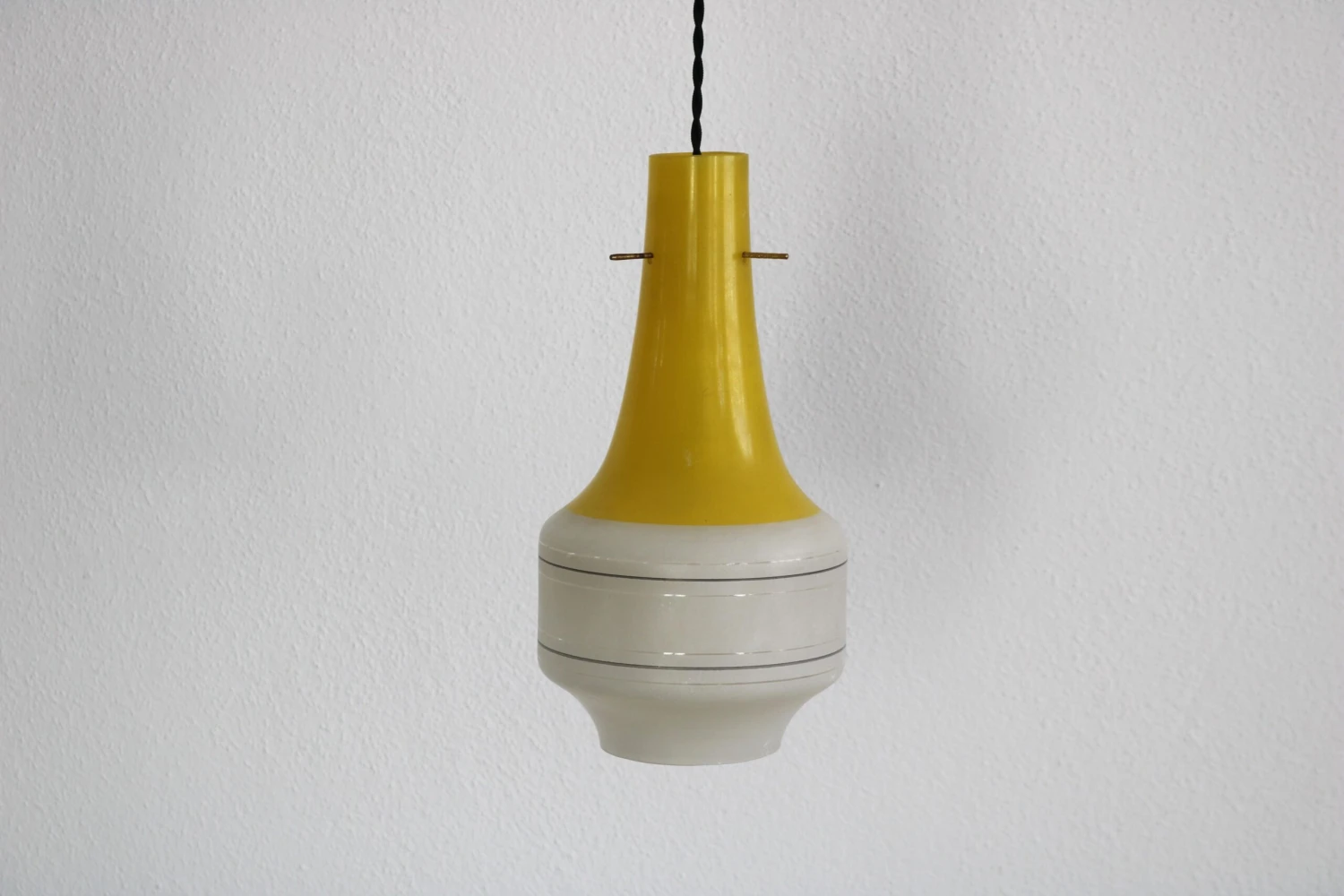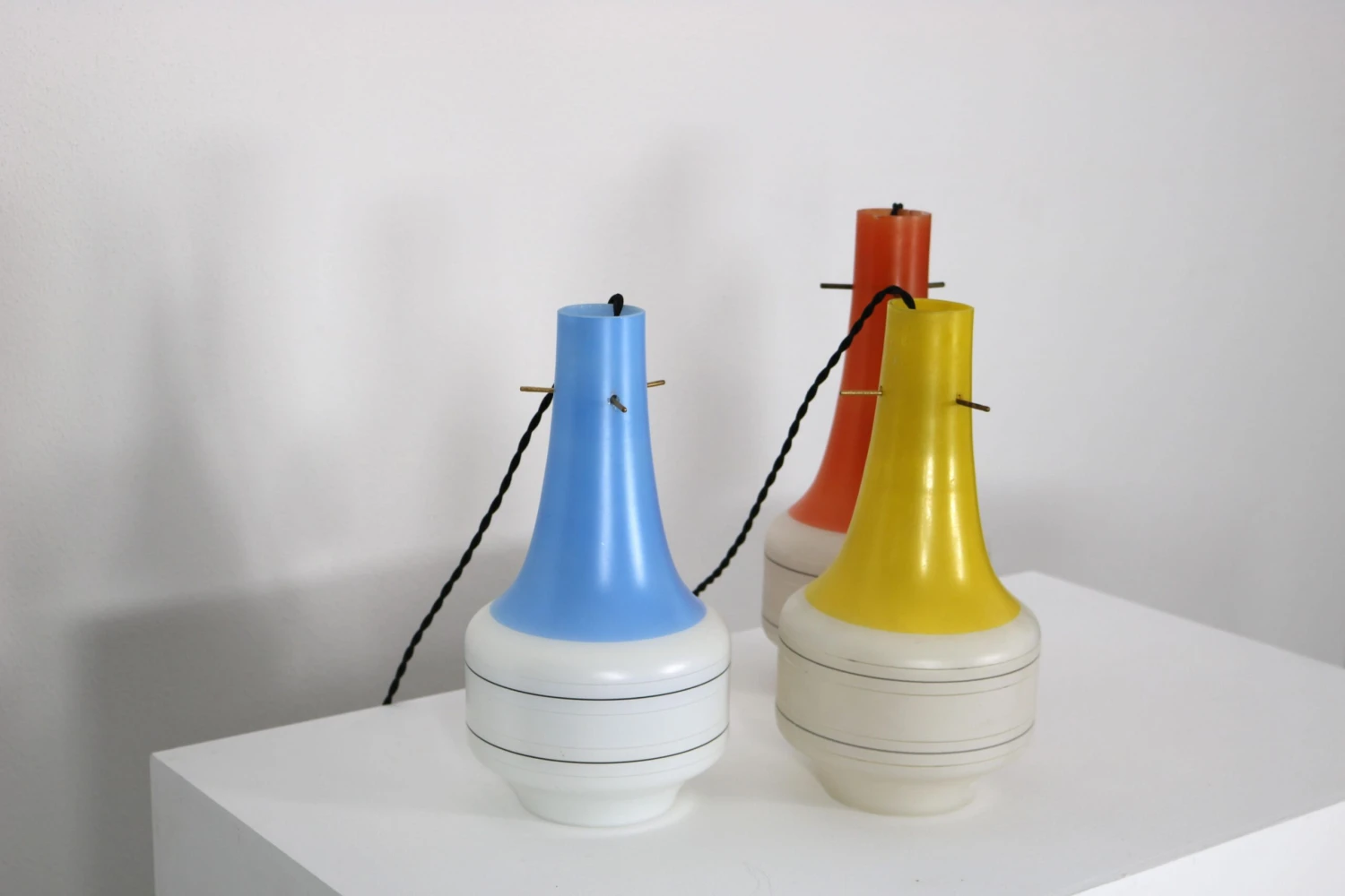 This Italian set of three glass pendant lamps dates back to the 60s. The Vistosi style set has three different colours, red yellow and blue. While the upper parts of the lamps are coloured, the lower parts are in matt white glass. The fabric cables of the lamps have been re-electrified. In general, all three pendant lamps are in a good Vinatge condition, the colours are a little faded.
