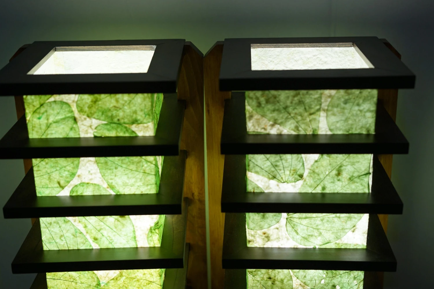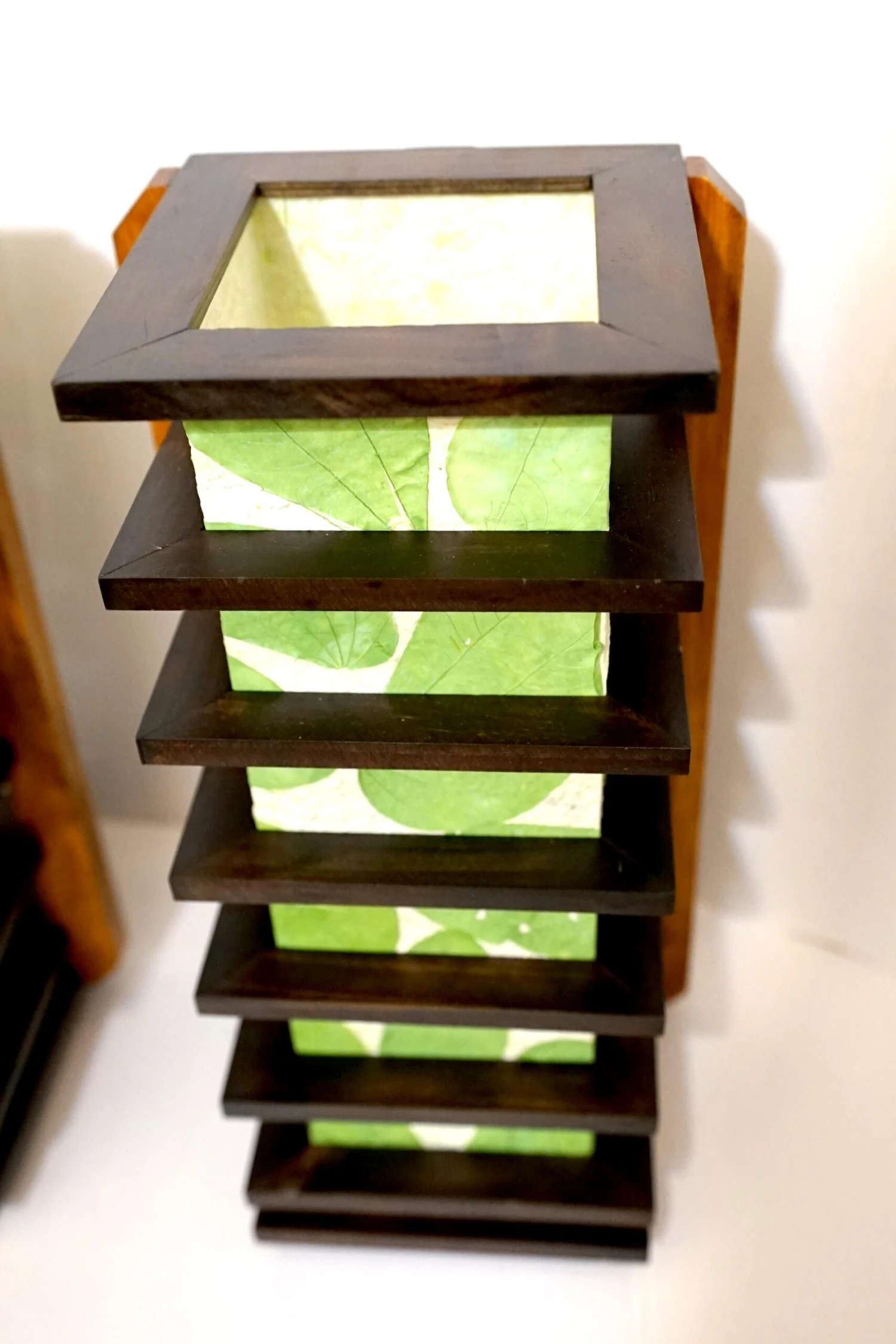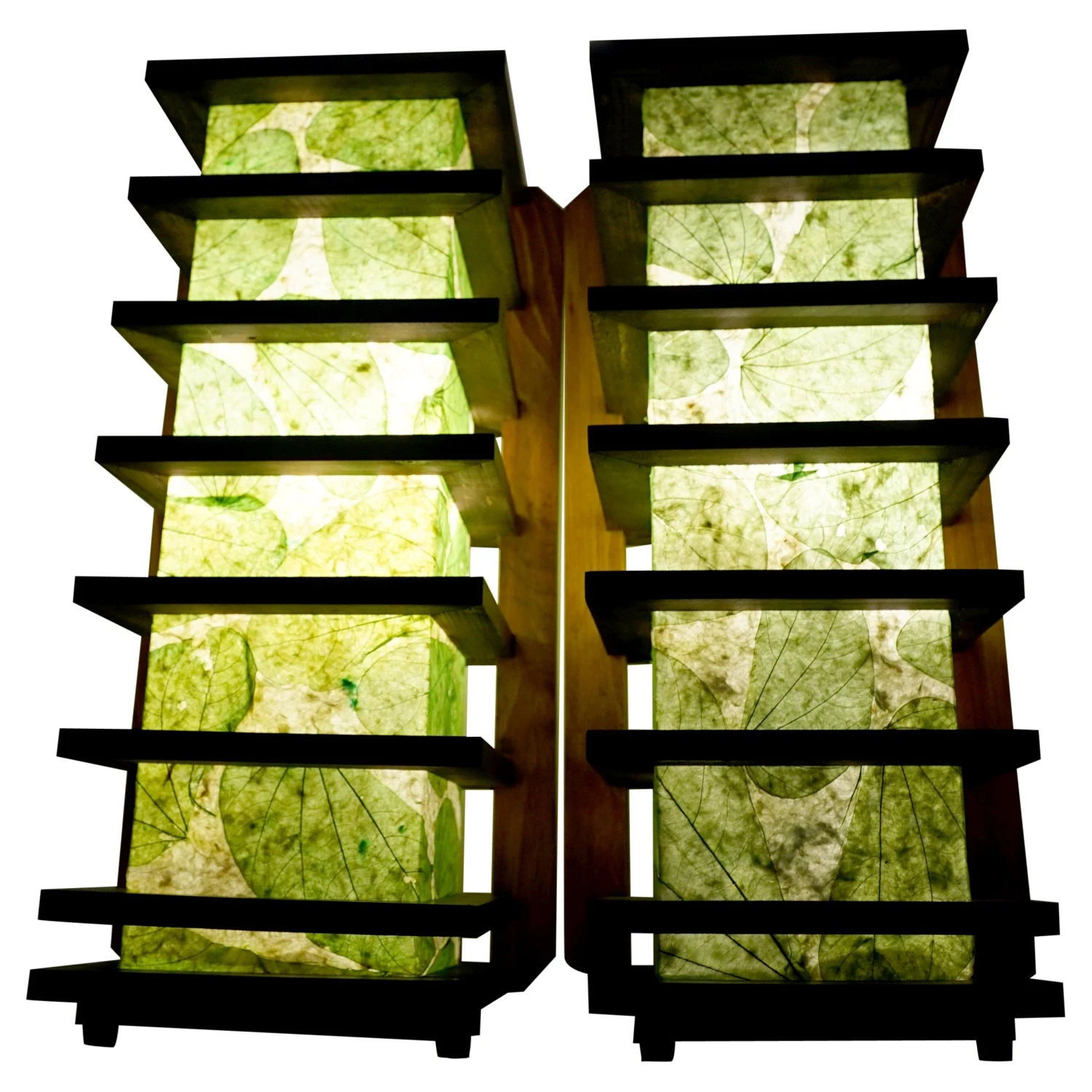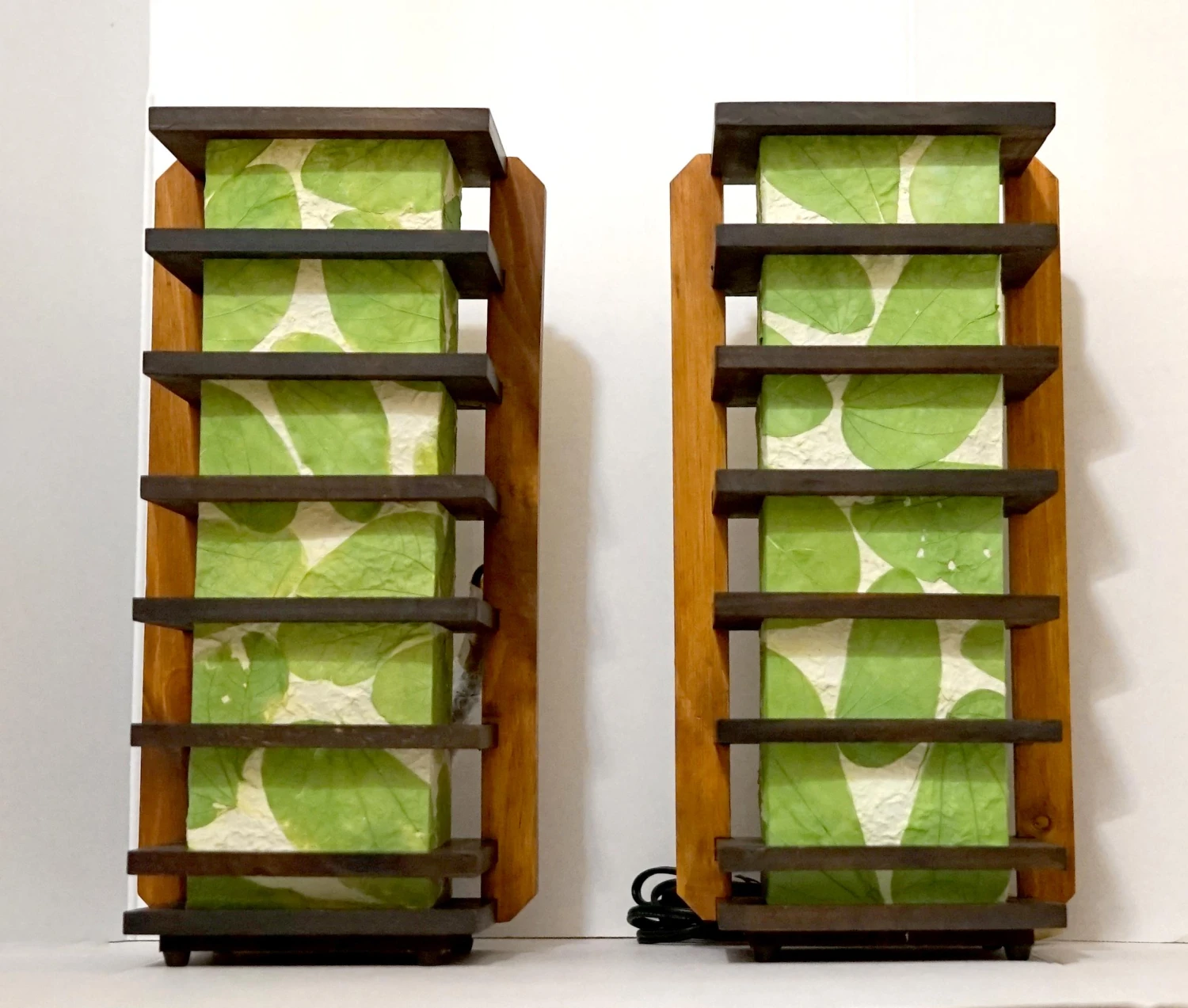 This set of sconces is architectural in appearance with walnut and teakwood details. The pair offers form and function with a warm light source and loads of chic design. Each fixture features decoupage with layers of leaves and rice paper encircled in geometric walnut tone rows. The leaves diffuse the light to produce a soft ethereal display. The pair has a bracket for hanging the lamps from the wall. The on/off switch is attached to the cord. This is a rare and elegant pair of wall lamps that can also be used as standing table pieces. The lamps measure 16.5 inches tall, 6 inches deep and 7 inches wide. These lamps bring a touch of nature to your decor and they wil; enhance any decor where plants are used.