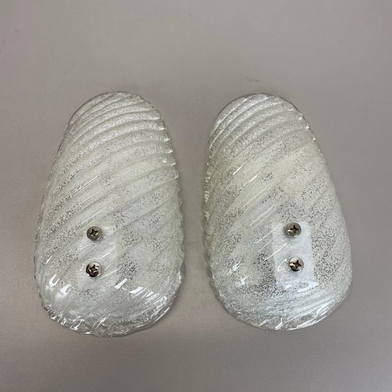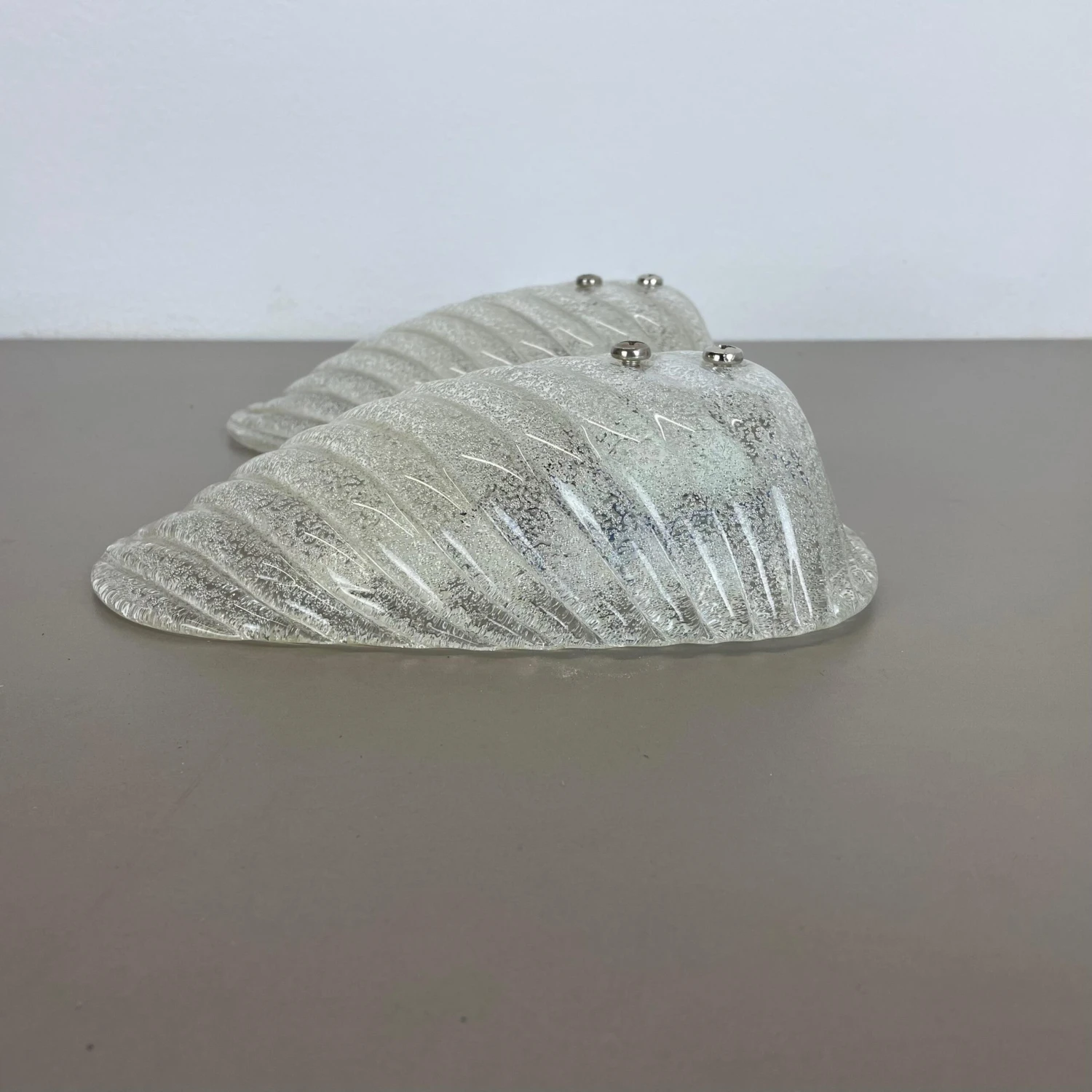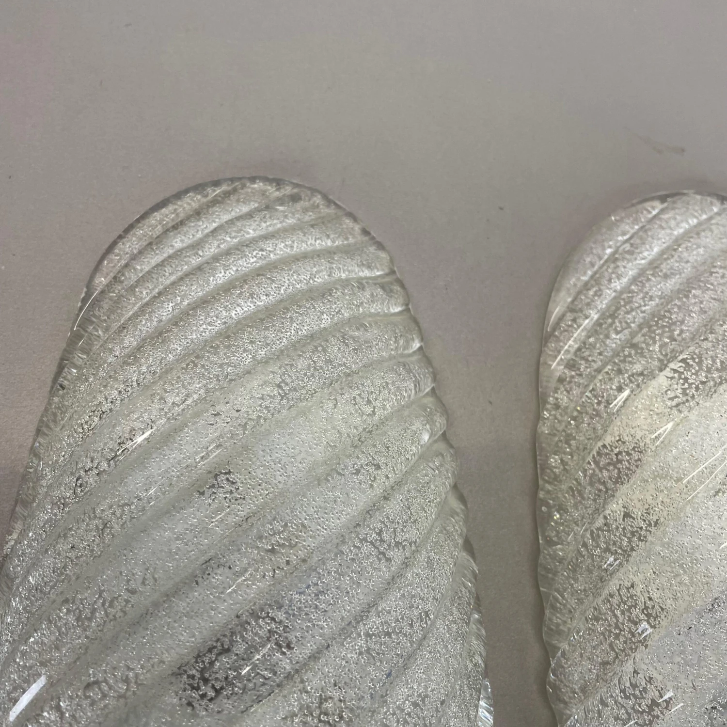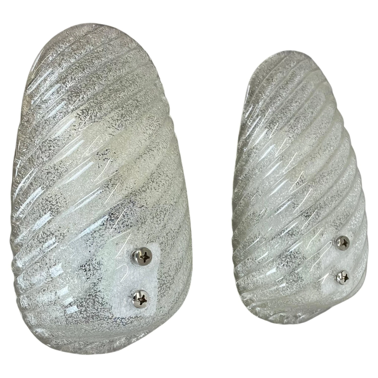 This set of two modernist lights was produced in Germany in the 1980s. It is made from murano glass front plate element and has a metal wall fixation. The lights have a fantastic abstract and Brutalist glass surface optic, very rare and unique design item of the 1980s . Each of this wonderful and rare lights has one socket for e 14 bulbs. The lights create of fantastic atmosphere of defused light.