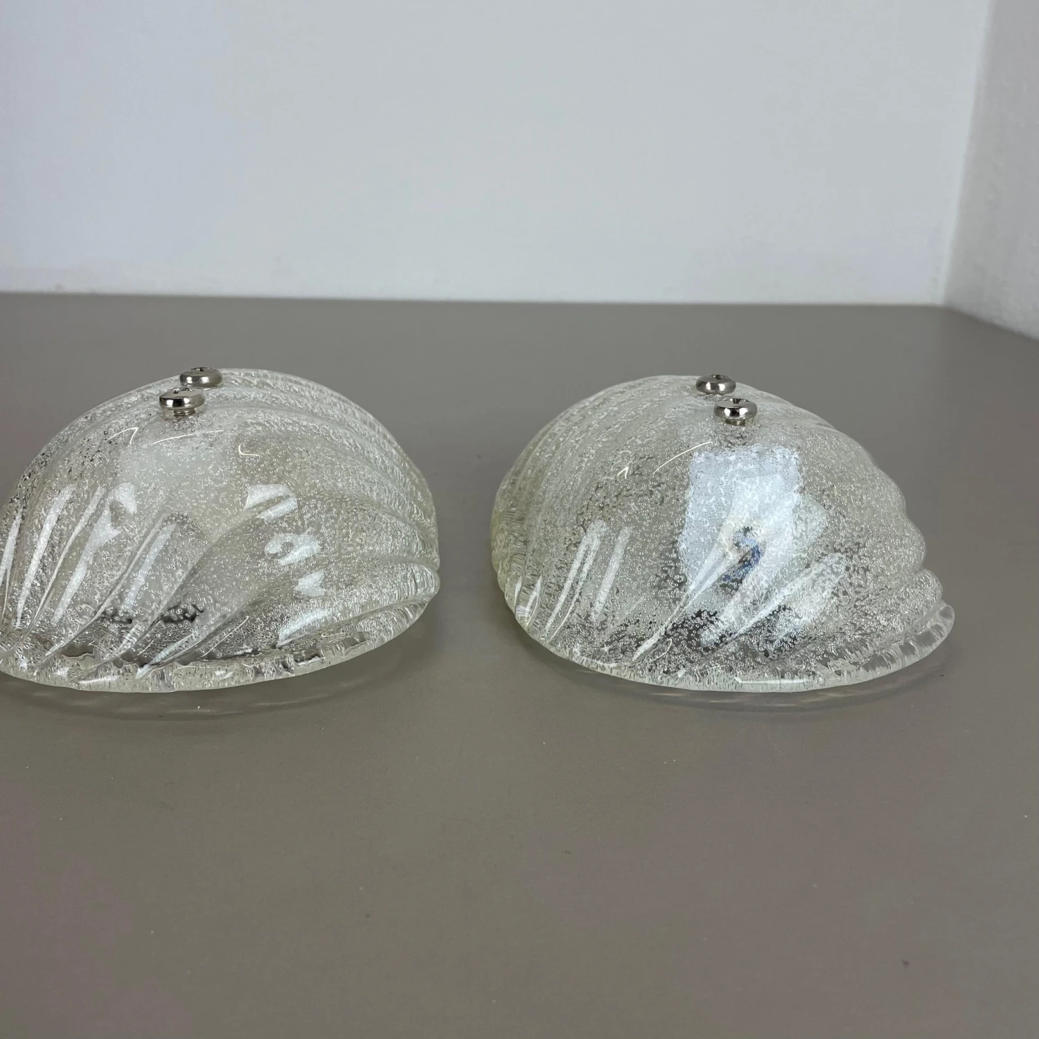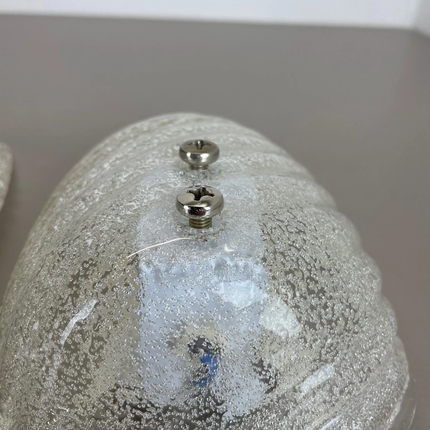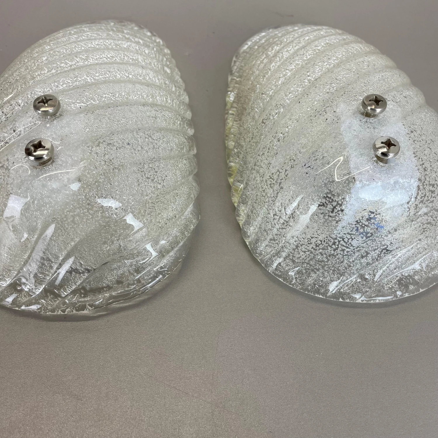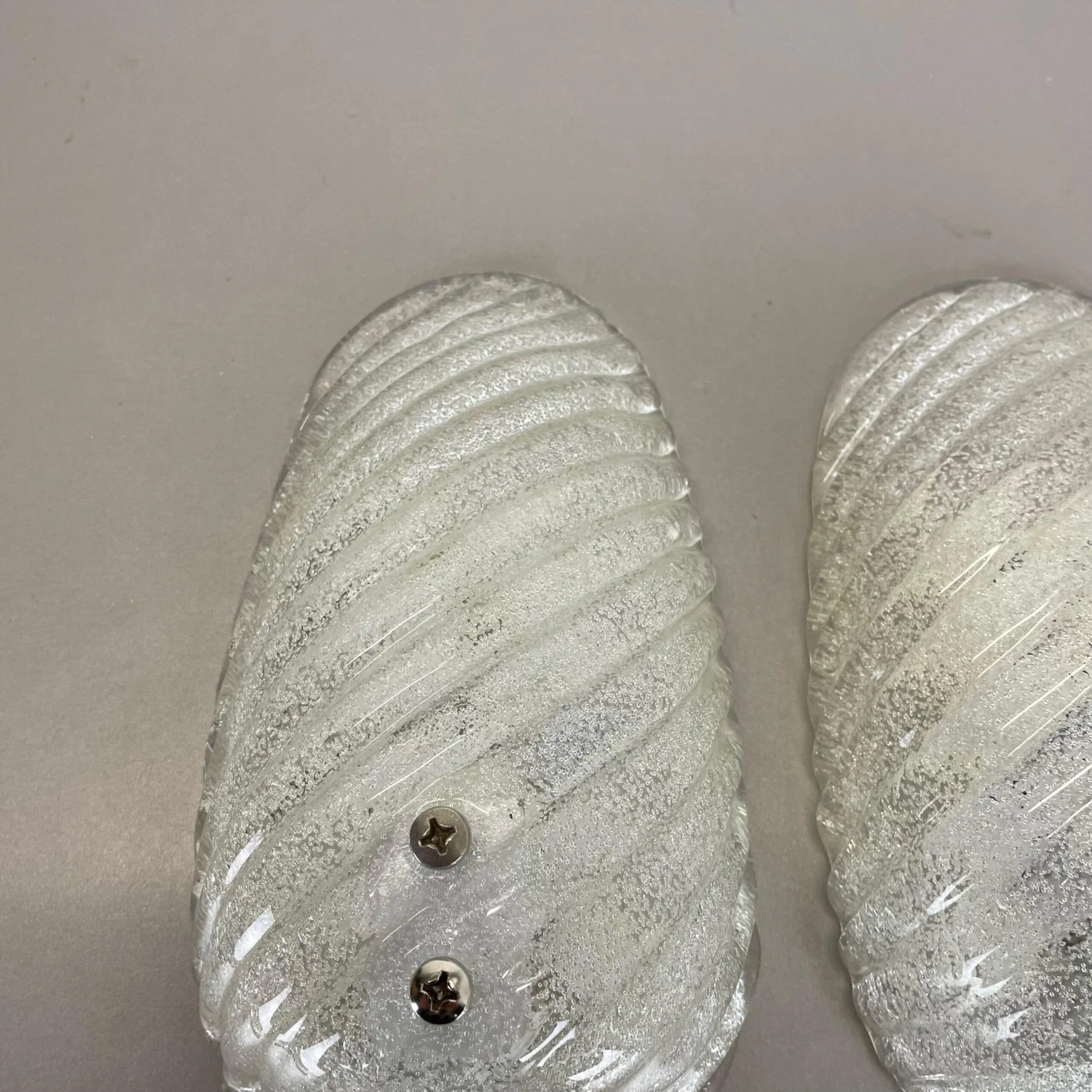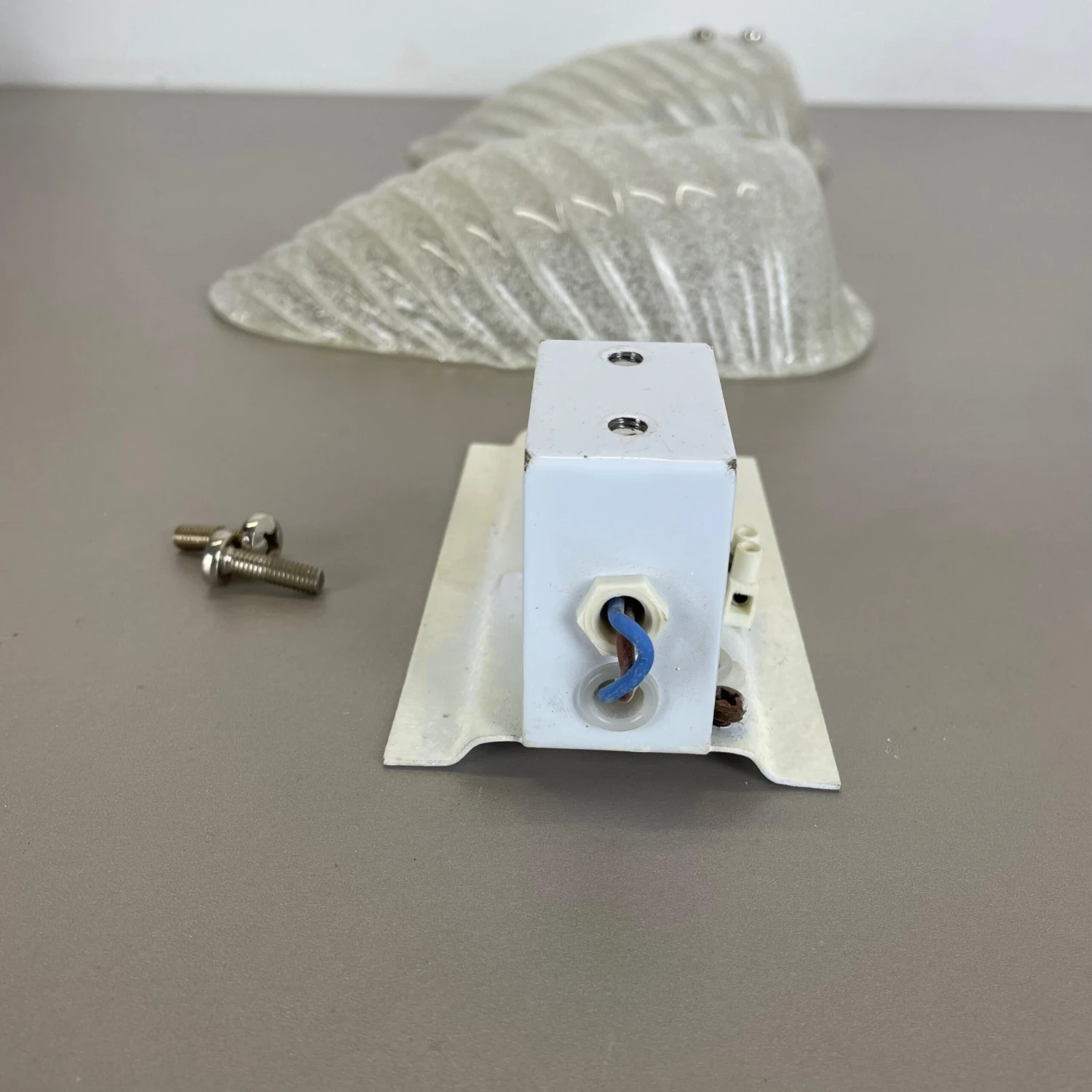 This set of two modernist lights was produced in Germany in the 1980s. It is made from murano glass front plate element and has a metal wall fixation. The lights have a fantastic abstract and Brutalist glass surface optic, very rare and unique design item of the 1980s . Each of this wonderful and rare lights has one socket for e 14 bulbs. The lights create of fantastic atmosphere of defused light.