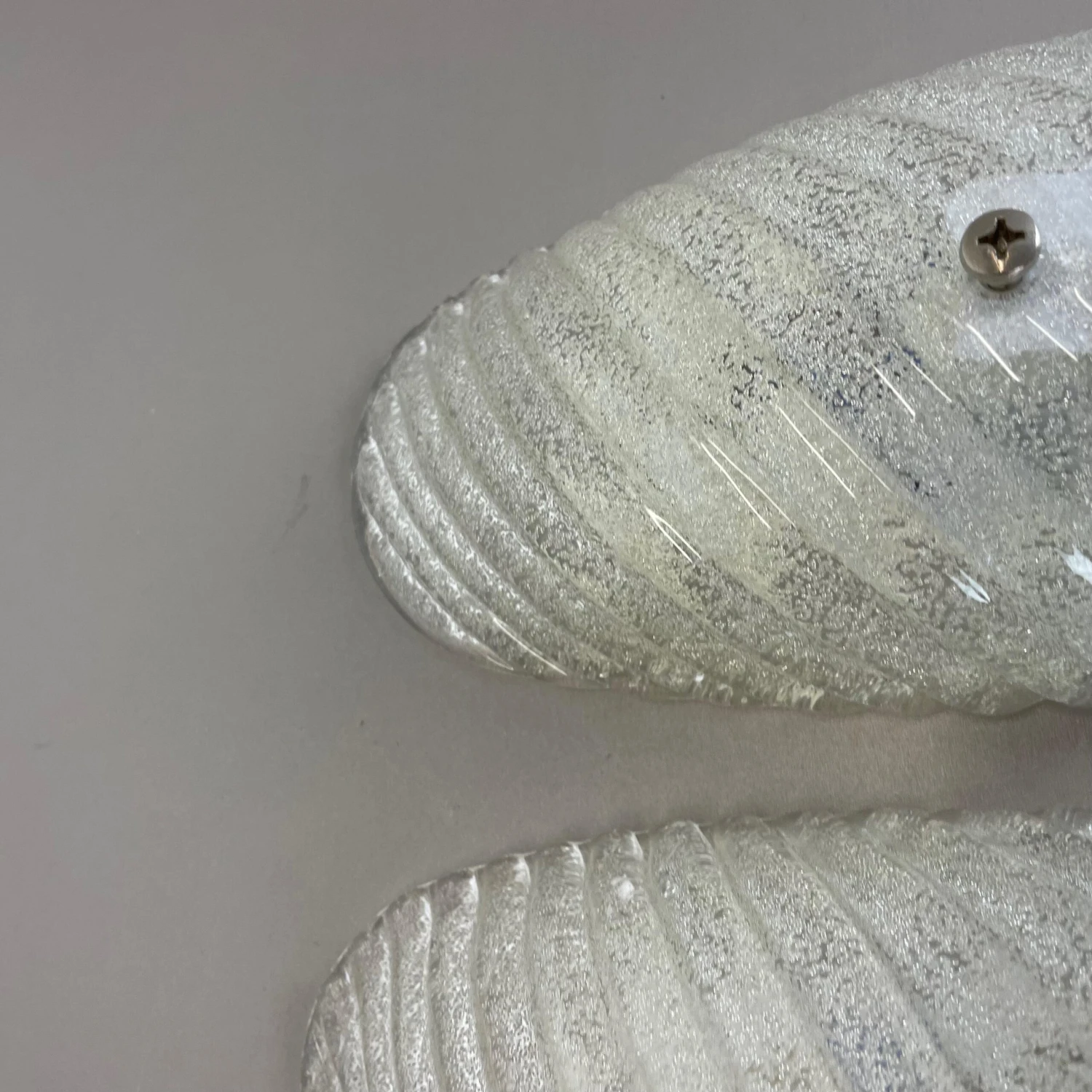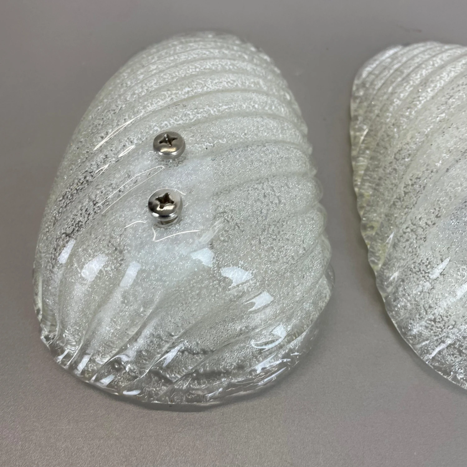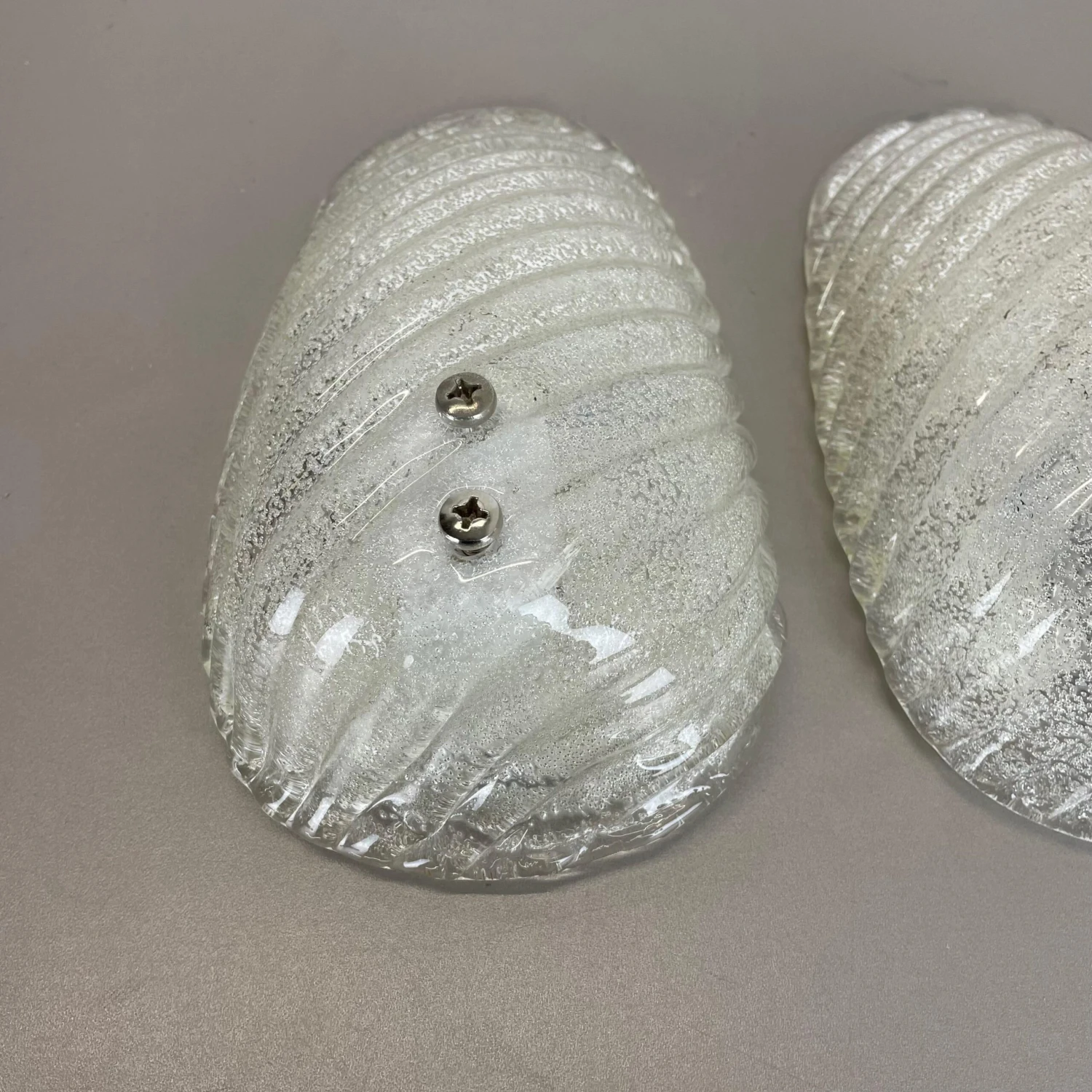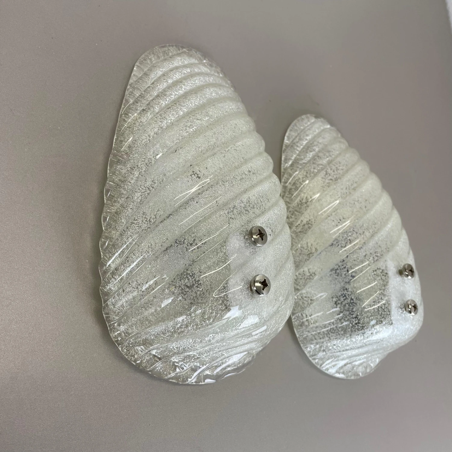 This set of two modernist lights was produced in Germany in the 1980s. It is made from murano glass front plate element and has a metal wall fixation. The lights have a fantastic abstract and Brutalist glass surface optic, very rare and unique design item of the 1980s . Each of this wonderful and rare lights has one socket for e 14 bulbs. The lights create of fantastic atmosphere of defused light.