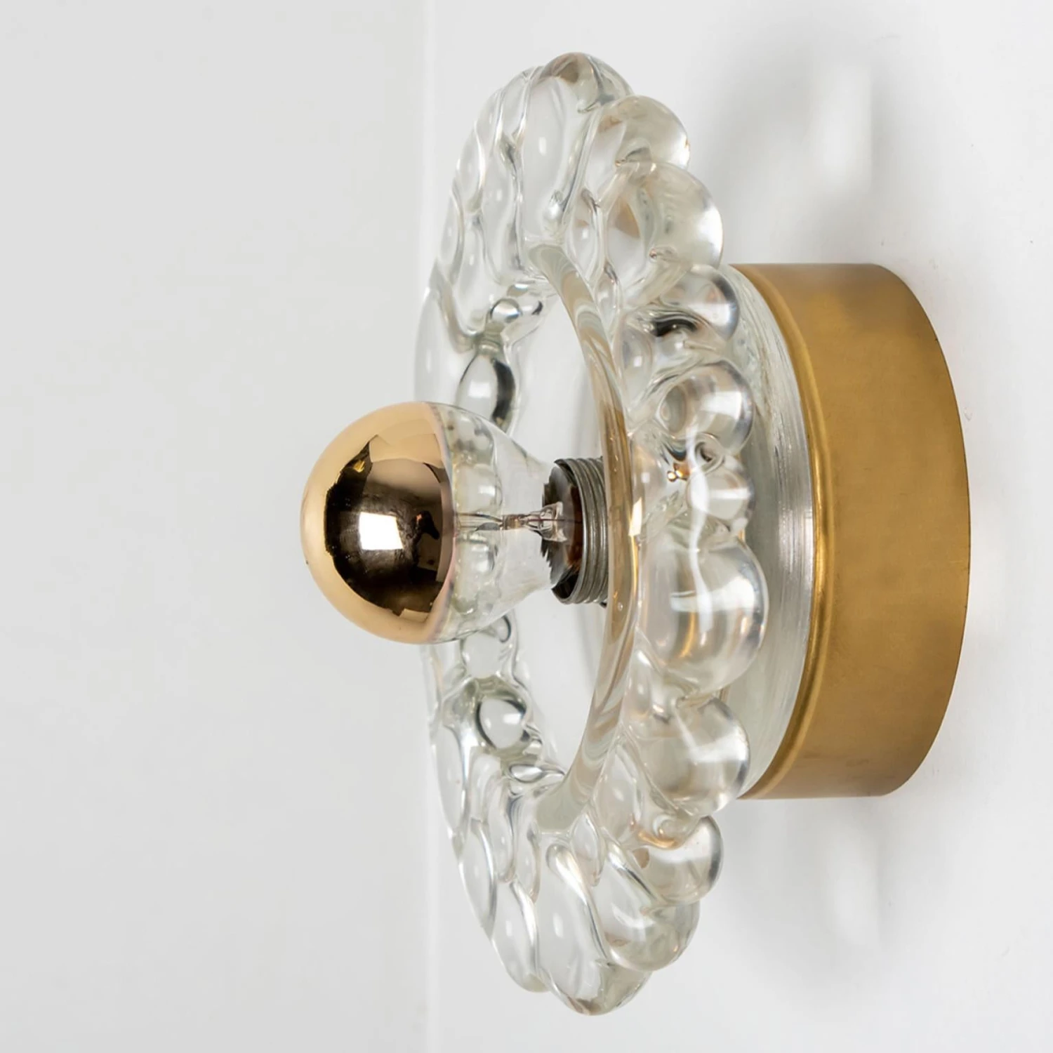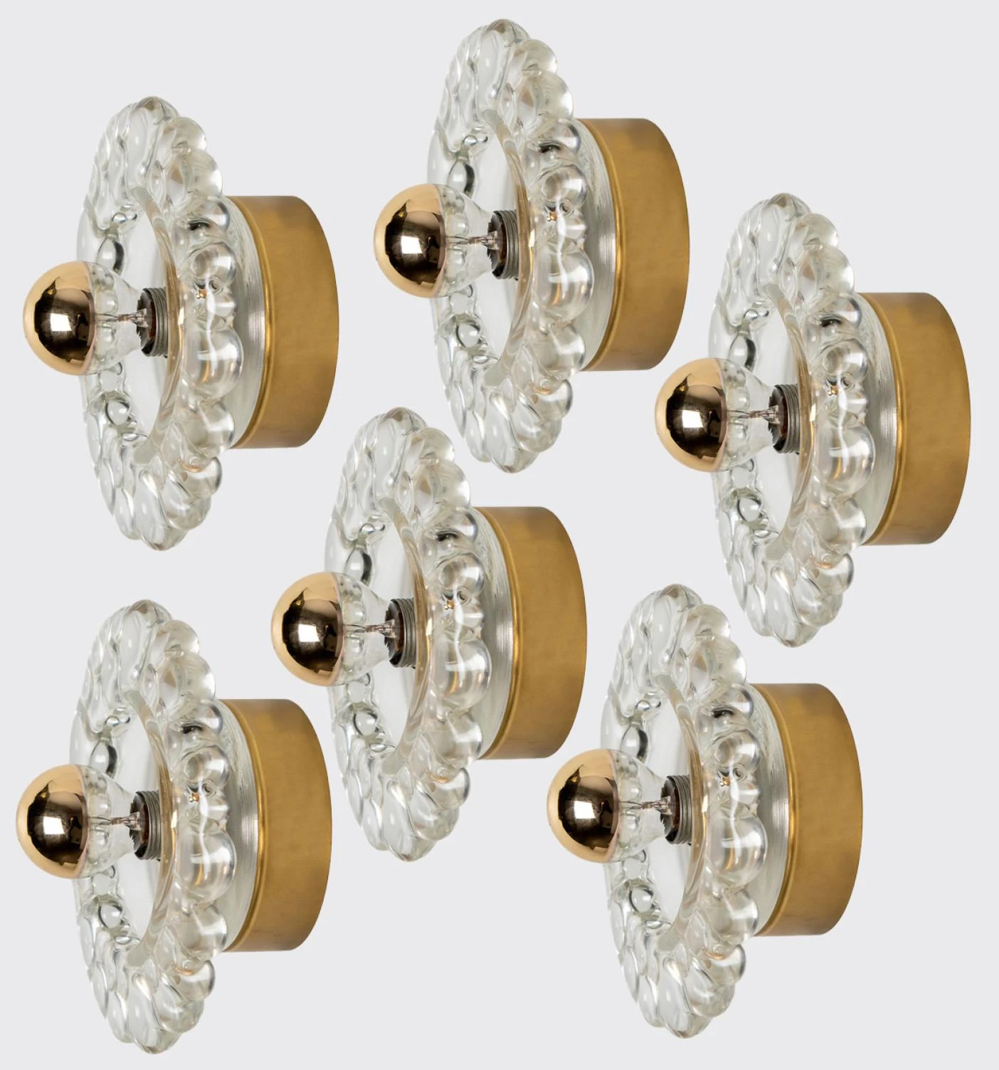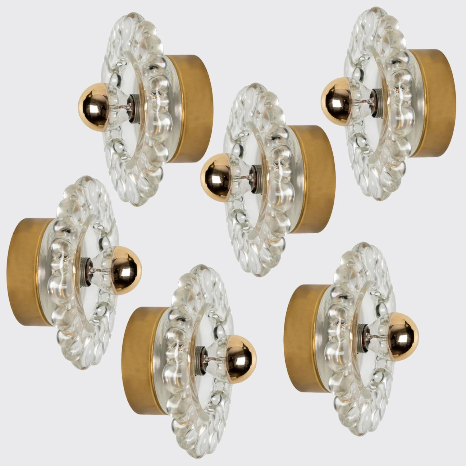 Set of 2 nice wall lamps by Hillebrand, Germany. Brass frame, wonderful chaped thick clear glass shade, 1 E27 fitting, her on the photo with gold colored mirrorhead bulbs. 1970s.