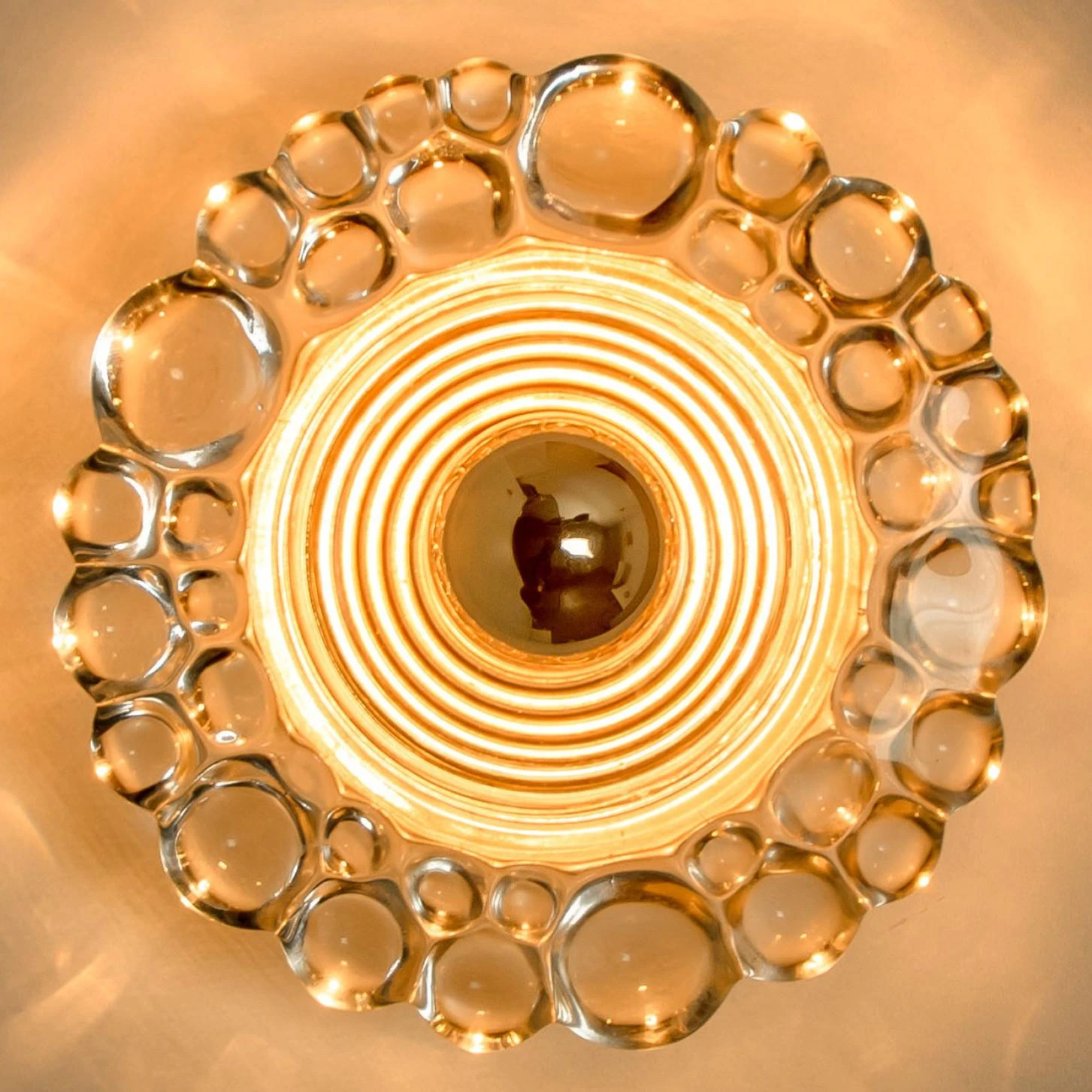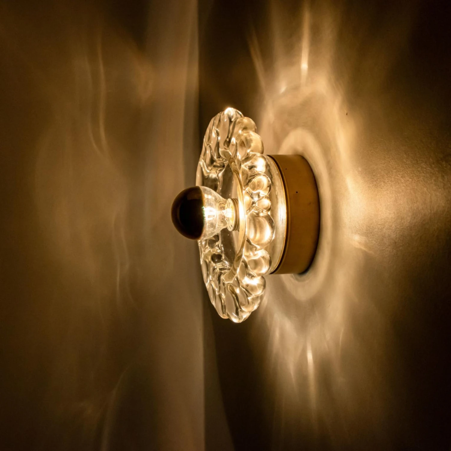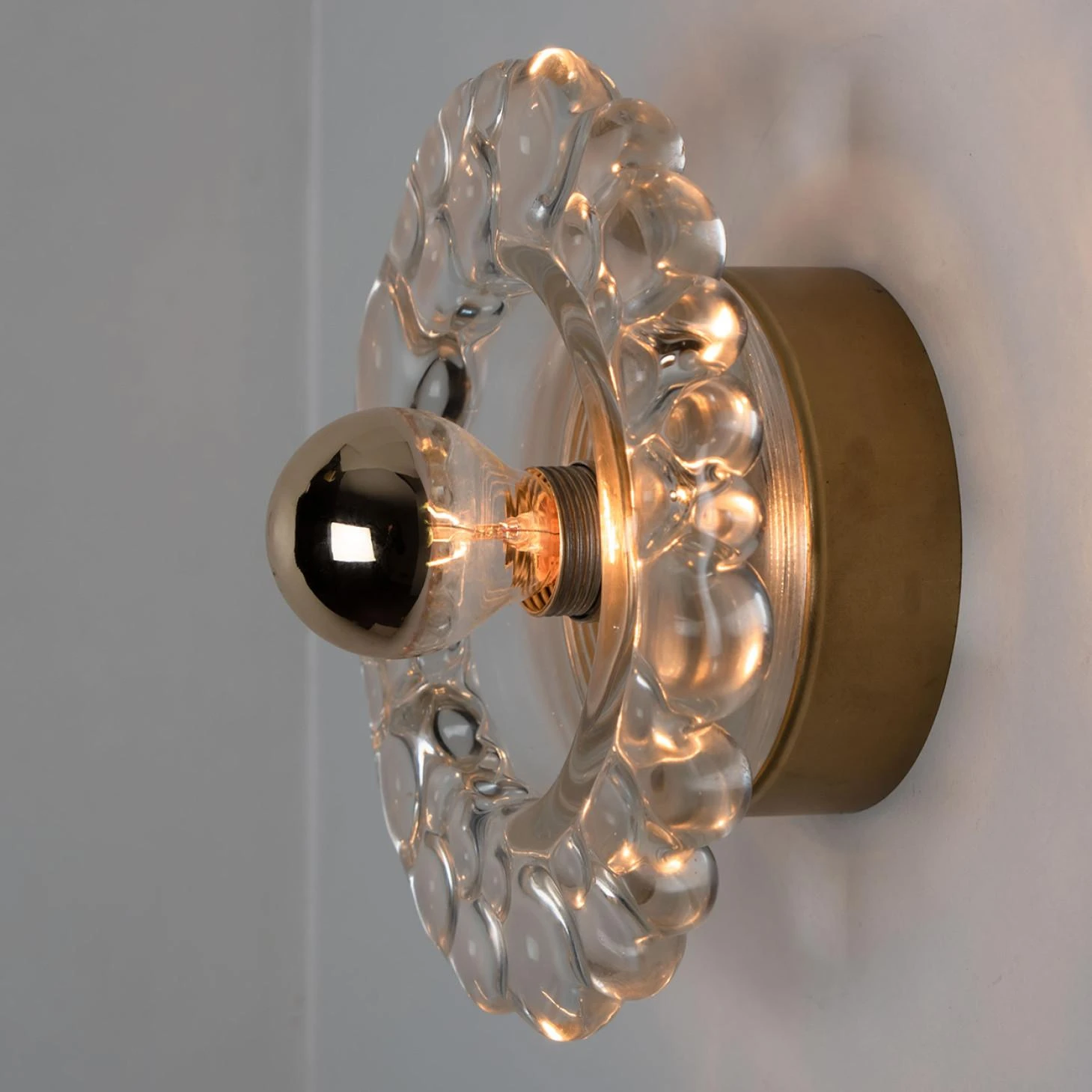 Set of 2 nice wall lamps by Hillebrand, Germany. Brass frame, wonderful chaped thick clear glass shade, 1 E27 fitting, her on the photo with gold colored mirrorhead bulbs. 1970s.
