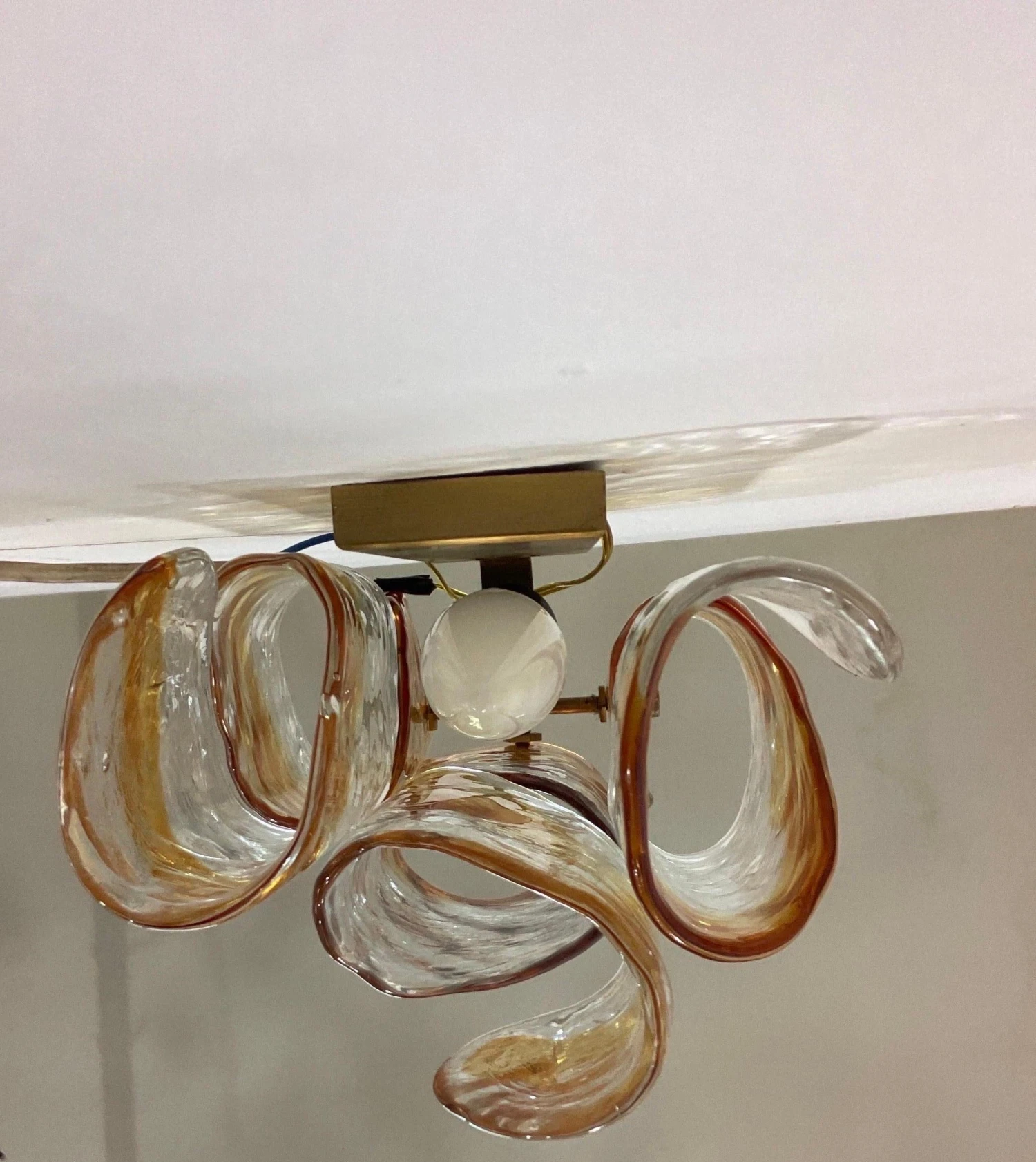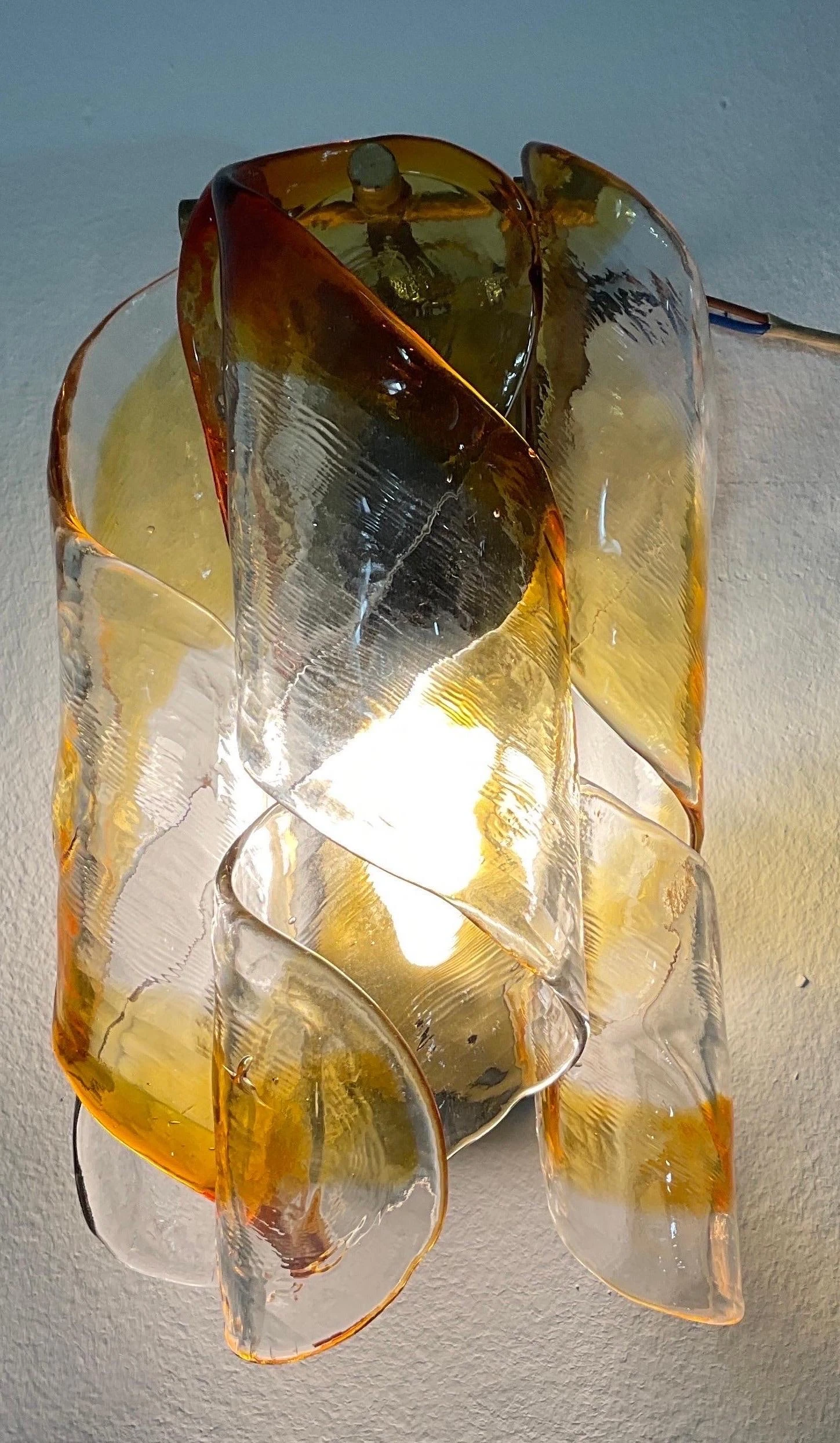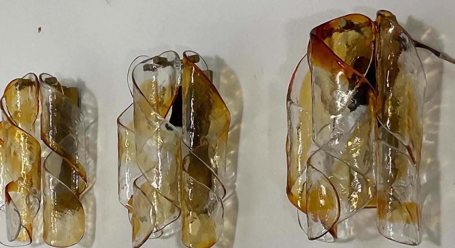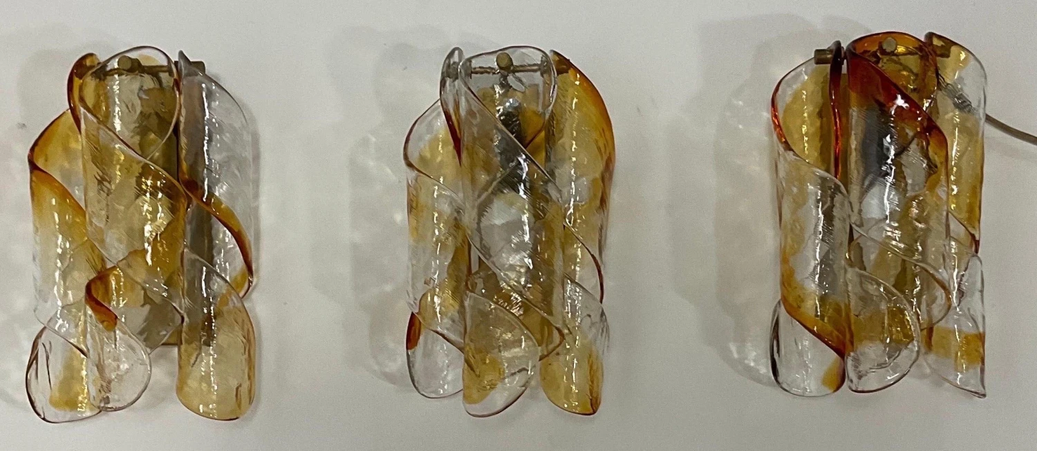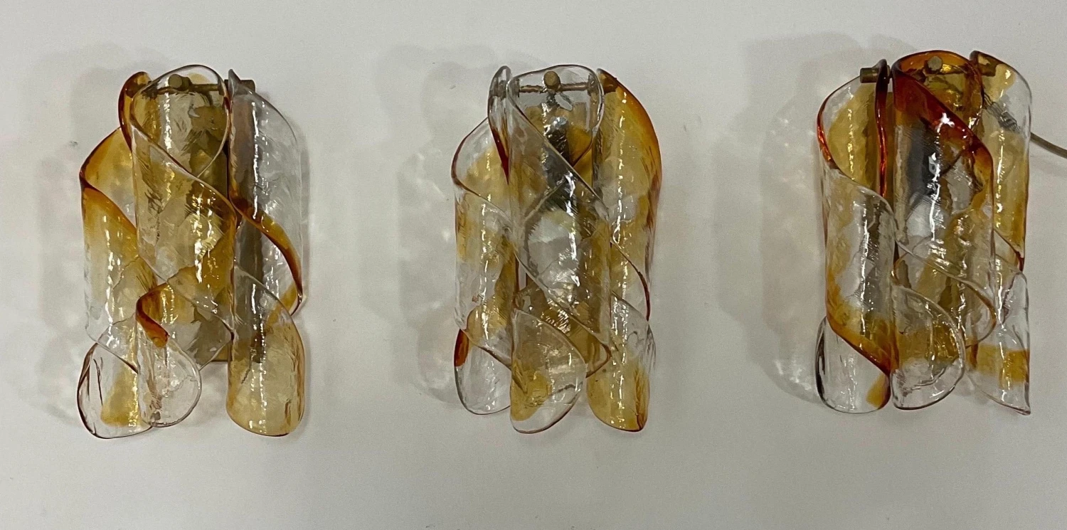 Three of beautiful Murano glass wall lamps attributed to Mazzega comes from Italy from the 1960s. Nicely curved ribbons made of hand-blown glass in two colors: crystal and amber with a brass base enrich any modern or mid-century interior, whether the sconces are lit or not. Light reflected through a thick amber glass and on a brass plate will additionally provide warm and pleasant illumination