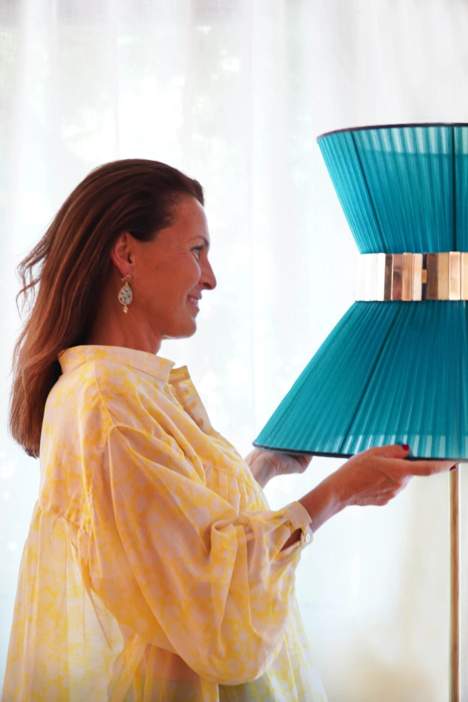 A lampshade entirely hand-wrapped with silk ribbons, available in a wide range of colors.