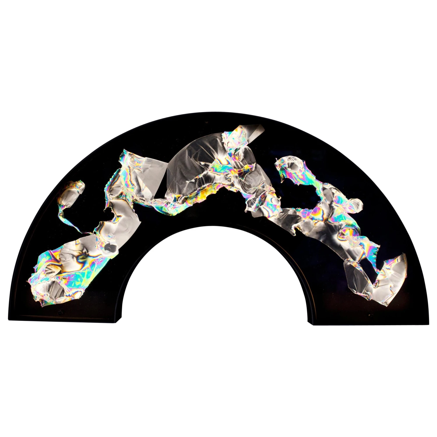 Willners research and exploration of the properties of polarized light – an optical phenomenon that occurs when waves of light oscillate in a single plane – led to experiments with light polarizers and different disposable plastics to play with bending, blocking and transforming light and force interference in the plastic to create various colorful material portraits.